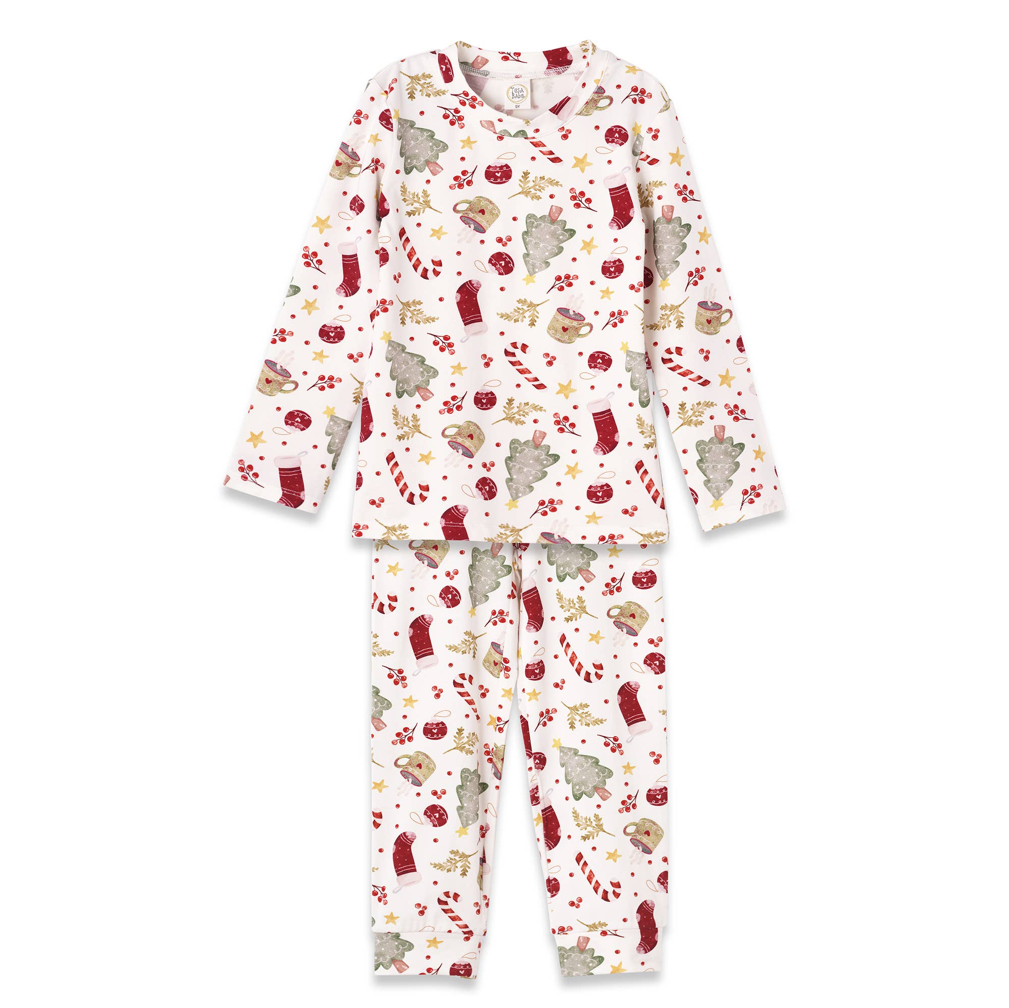 This ultra-soft kids pajama set features a delightful holiday print and is the perfect mix of comfort and fun. Made from a bamboo-spandex blend, these PJs are cozy, absorbent, hypoallergenic, and eco-friendly. The top has a classic crew neck, and the bottoms have a comfy elastic waistband. Machine washable and tumble dry low for effortless care, making bedtime a breeze!