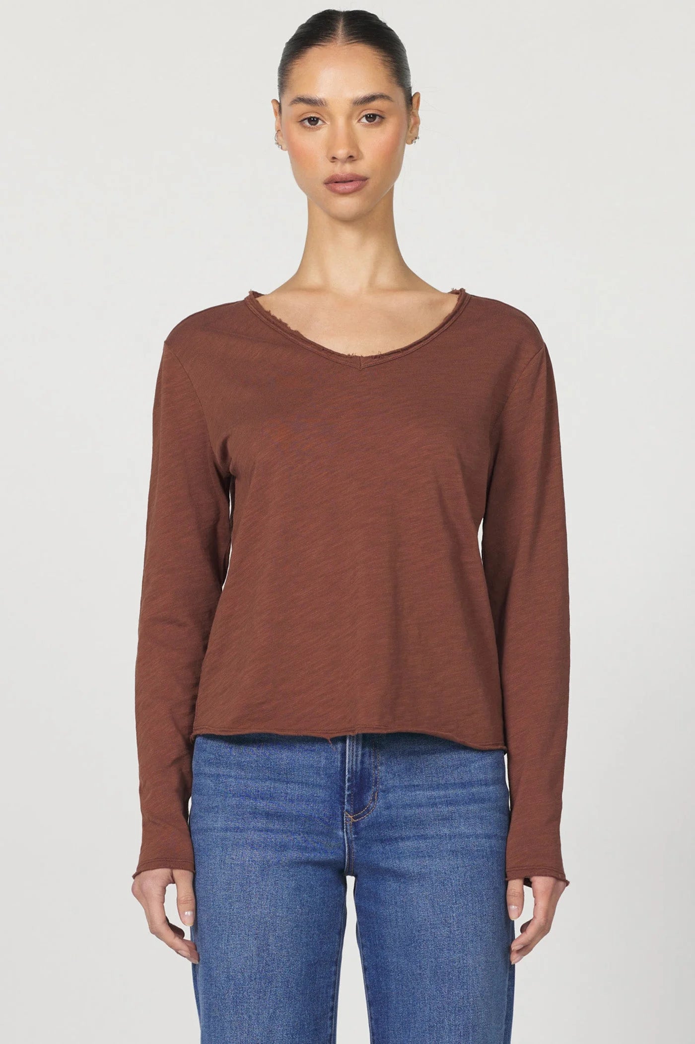 This versatile top features a flattering V-neckline and chic raw edge details, creating an effortlessly modern aesthetic perfect for any occasion.