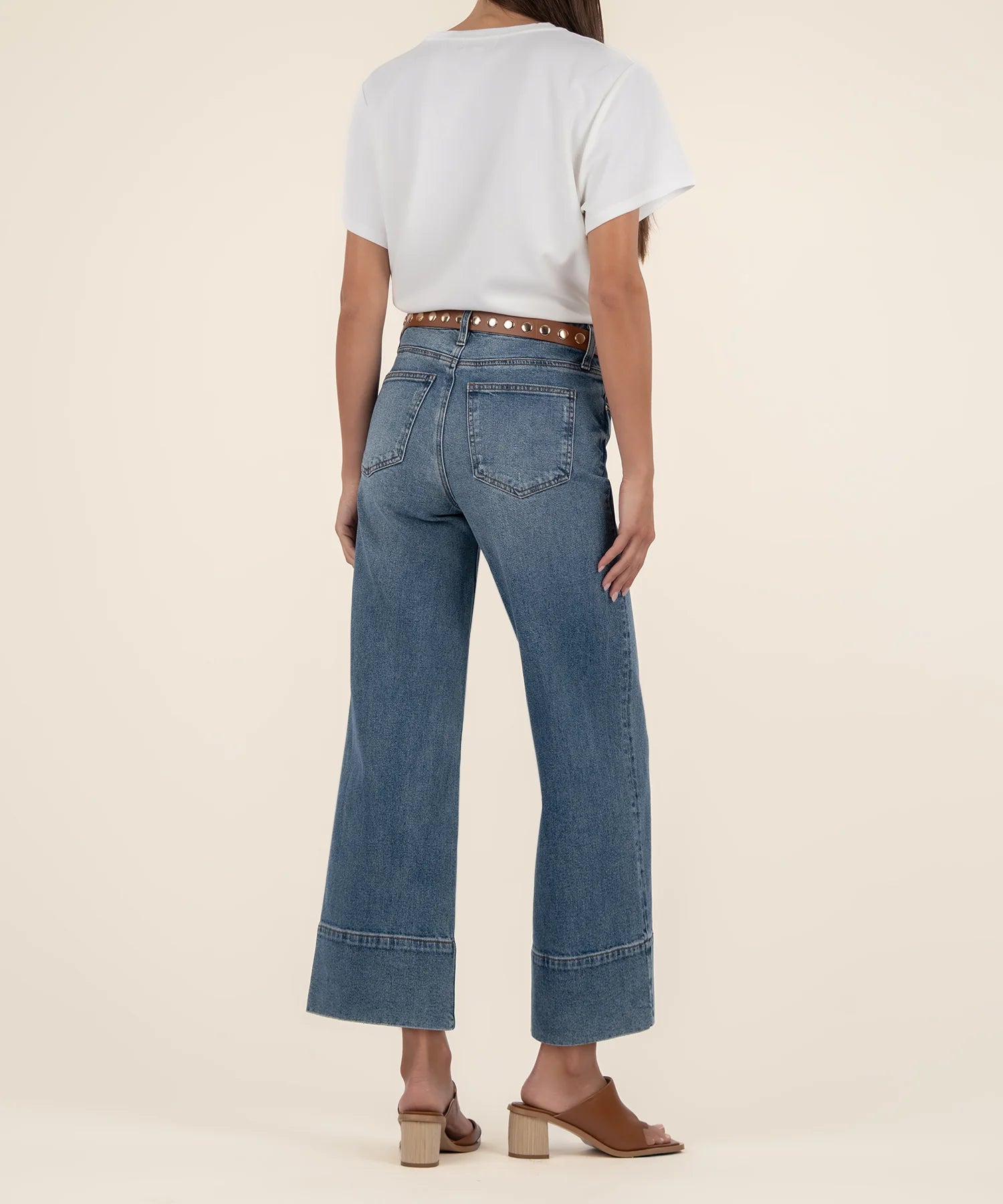 • These high-rise pants feature a wide leg silhouette with front pin tuck detailing that adds a touch of structure. The wide hem detail gives them a refined finish, making them an easy choice for both casual and elevated looks.