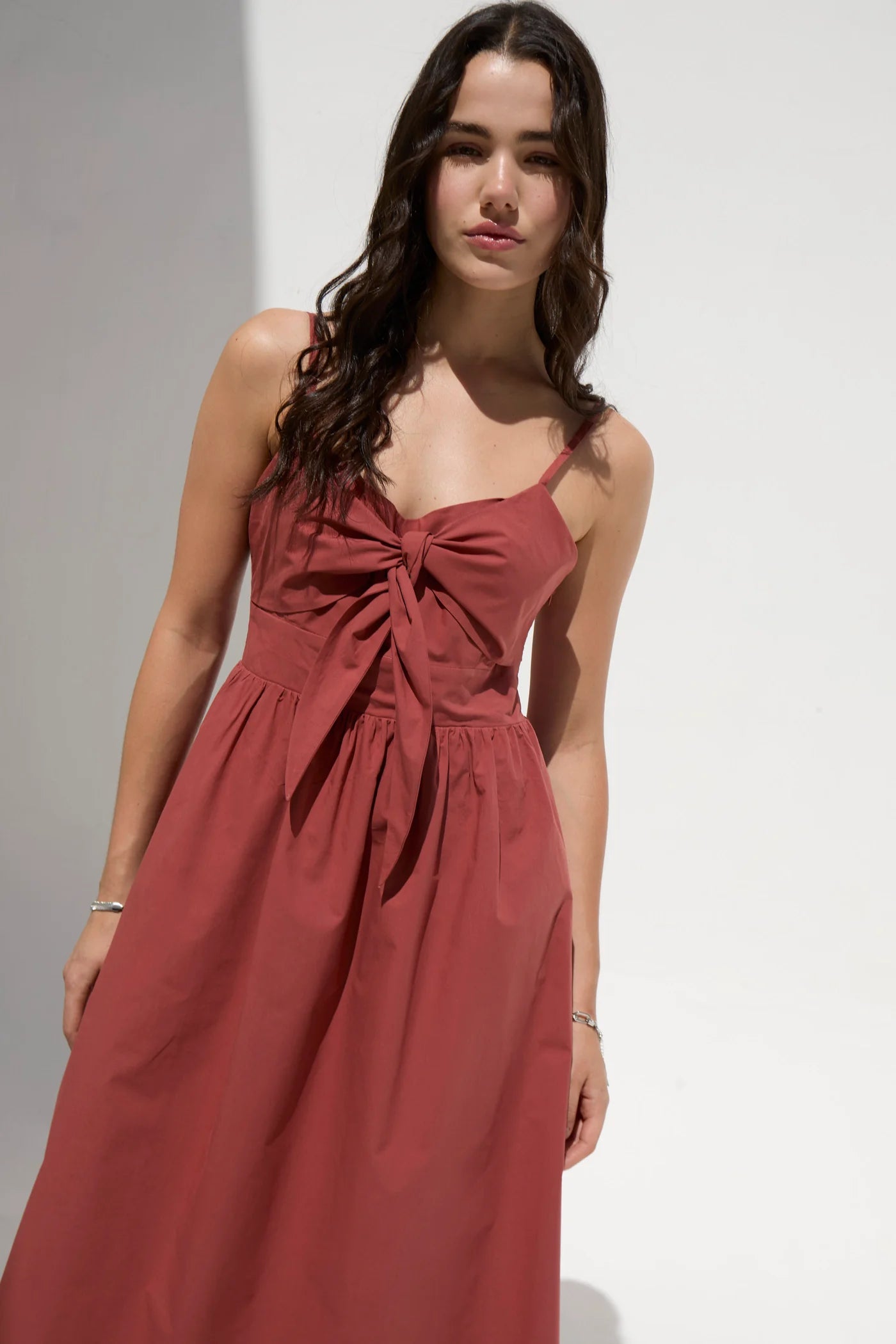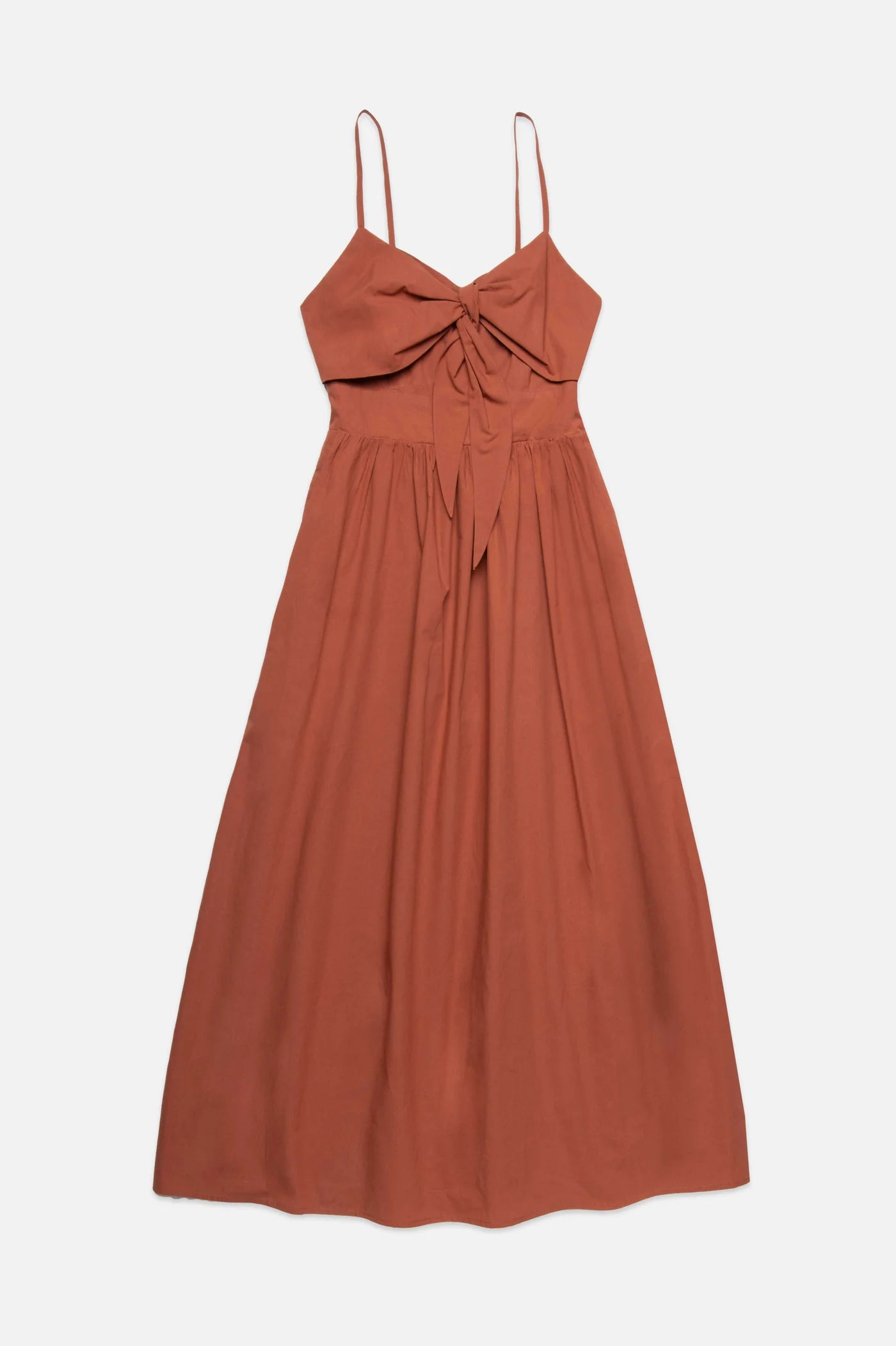 Poplin sleeveless maxi dress with V neckline. Self tie bow on bust. Cut on waist. Smocked detail on the back. Adjustable straps. Side pockets. Skirt lined. Invisible zipper on the side