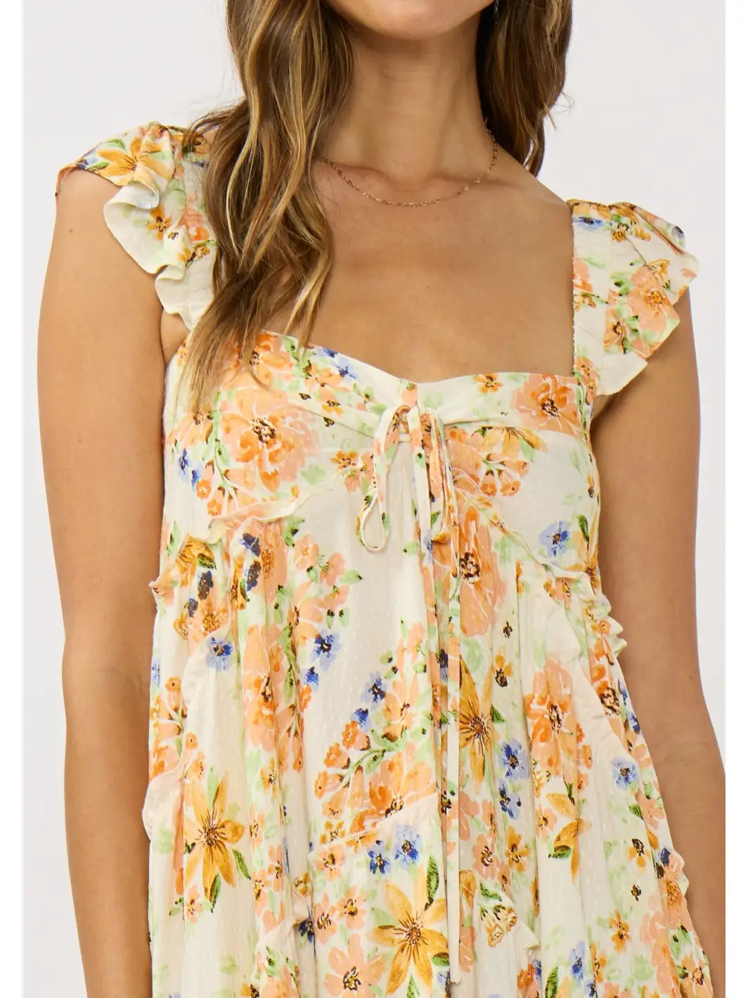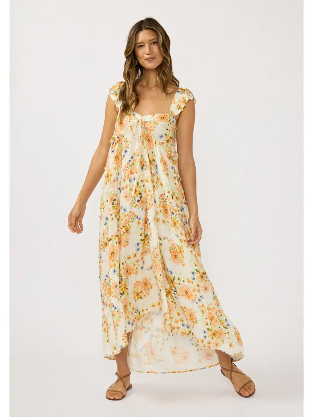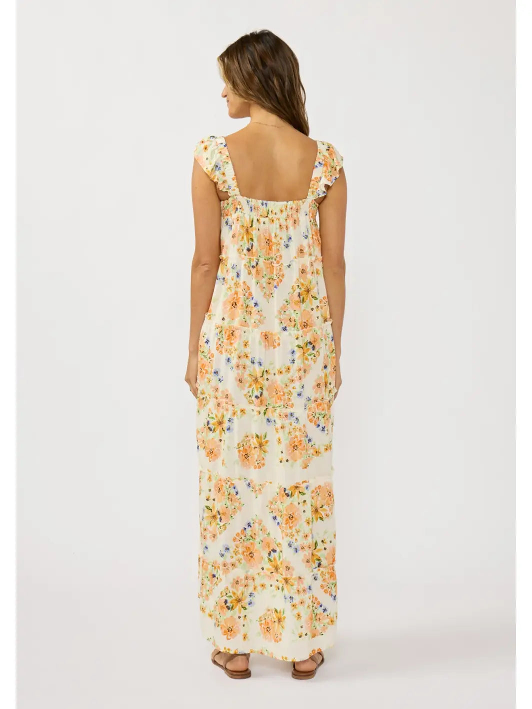 This romantic maxi dress features a delicate floral jacquard that whispers elegance with every step. Thick elastic straps adorned with ruffles frame the shoulders, while flutter sleeves add a whimsical touch. The ruched neckline draws the eye upward, and a smocked back provides subtle structure. Tiered ruffle panels cascade down the silhouette for movement and dimension, while hidden side pockets keep you practical without sacrificing style. Perfect for those who want to feel effortlessly put-together.