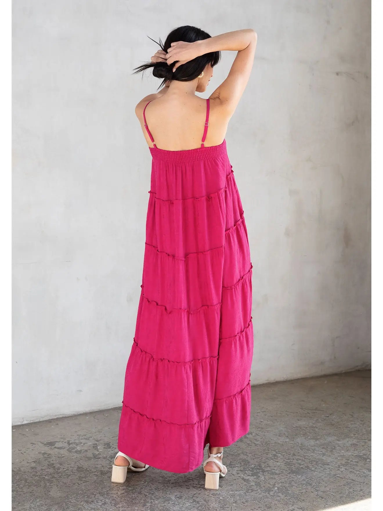 Twirl into summer in this enchanting rose jacquard maxi dress. The sweetheart neckline ties at the front while adjustable spaghetti straps keep everything in place, and the empire waist creates a flattering, effortless silhouette. Tiered layers add movement and dimension, while practical side pockets let you carry what matters. Ruffle accents and delicate floral jacquard give this loose, flowing dress its signature romantic charm—a customer favorite that works as hard as you do.