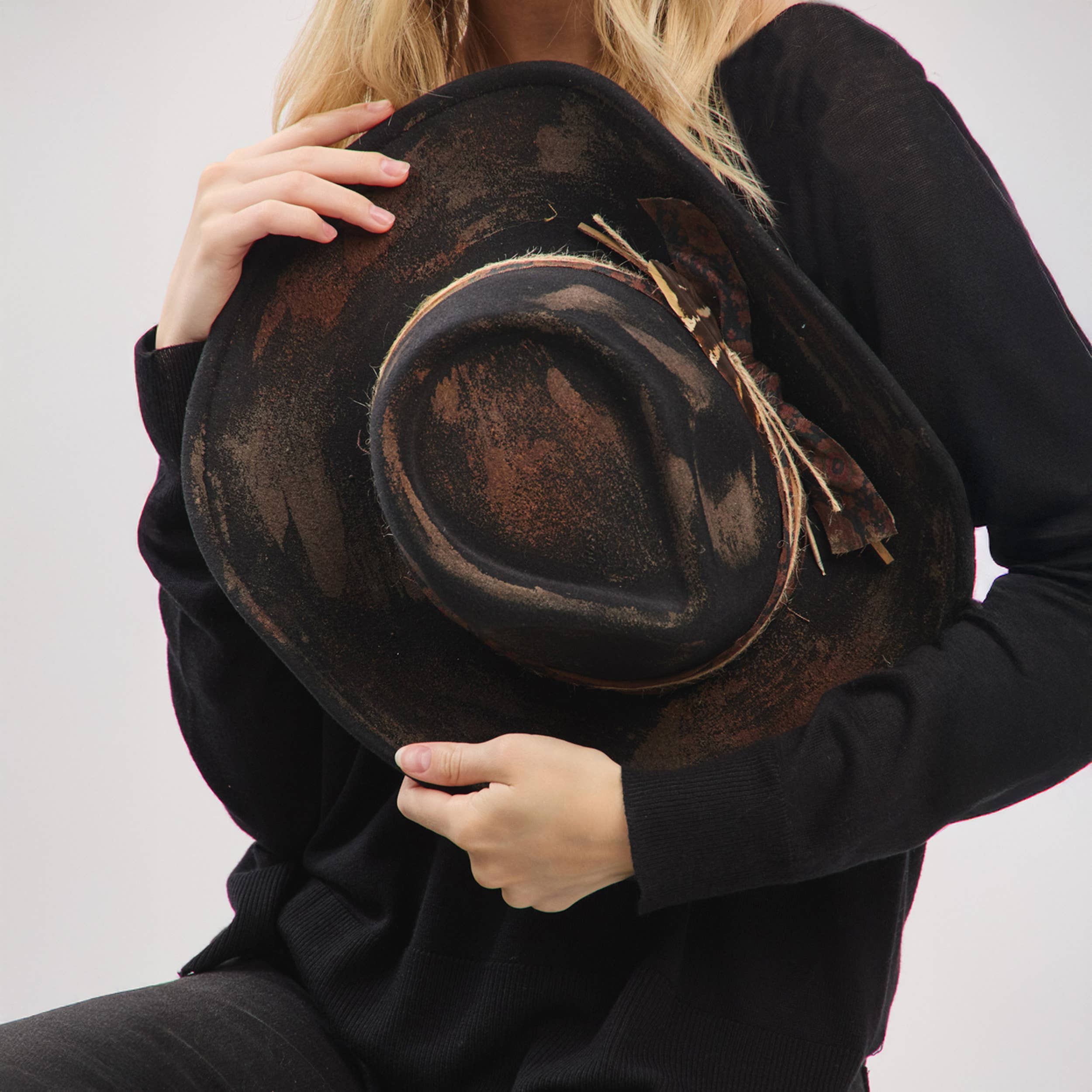 Rock two timeless styles with a single statement piece! This versatile cowgirl fedora flips between classic Western vibes and modern fedora chic, thanks to its flexible brim that bends to your vision. Distressed fabric detailing and a charming feather accent add personality and edge. Crafted from 100% polyester for durability and easy care. One size fits most. Whether you're channeling ranch-ready swagger or urban sophistication, this hat adapts to however you want to wear it.