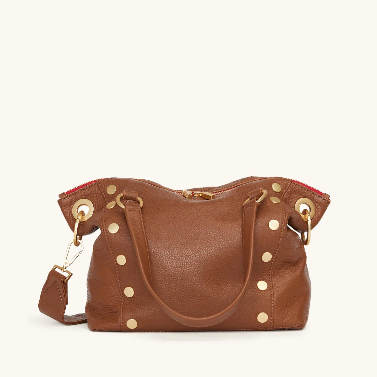 Get down to business with this compact take on our classic Daniel satchel. Crafted with additional rivets, a double zippered pocket, three interior drop pockets and reinforced hardware, the revamped Daniel is ready to take on your busy calendar. Ready to set a meeting? A cousin of our best-selling mahogany suede collection, this leather features a soft pebbled texture with a hint of shine. Embrace the warm allure of this medium brown hue, enriched with a delicate yellow undertone that adds depth and sophistication to any ensemble.