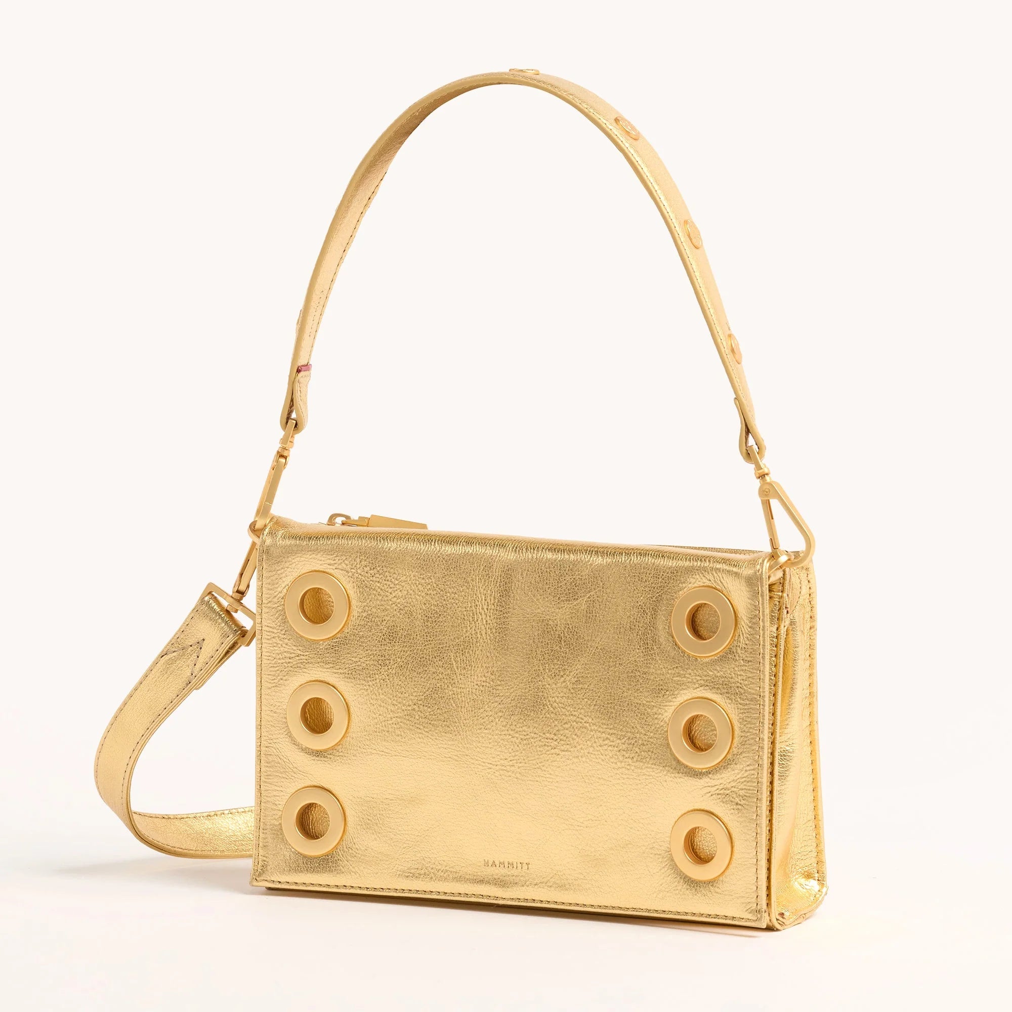 It doesn't get more iconic than this. We're re-introducing our Montana Clutch, now with bold details that celebrate our heritage. This clutch includes a vintage-style Hammitt strap, complete with a bonus riveted short strap, and grommets. With three compartments, this bag is functional and soon to be your everyday go-to. Get set to shimmer with our much-anticipated Gala Gold collection, elegantly crafted from luxurious Italian leather. A rich pebbled texture is enhanced by an iron-pressed finish and a glossy top layer, creating a mesmerizing two-tone effect. This classic gold hue captures the grandeur and elegance of a night at the theater - but it's sure to elevate your shoulder game all year long.