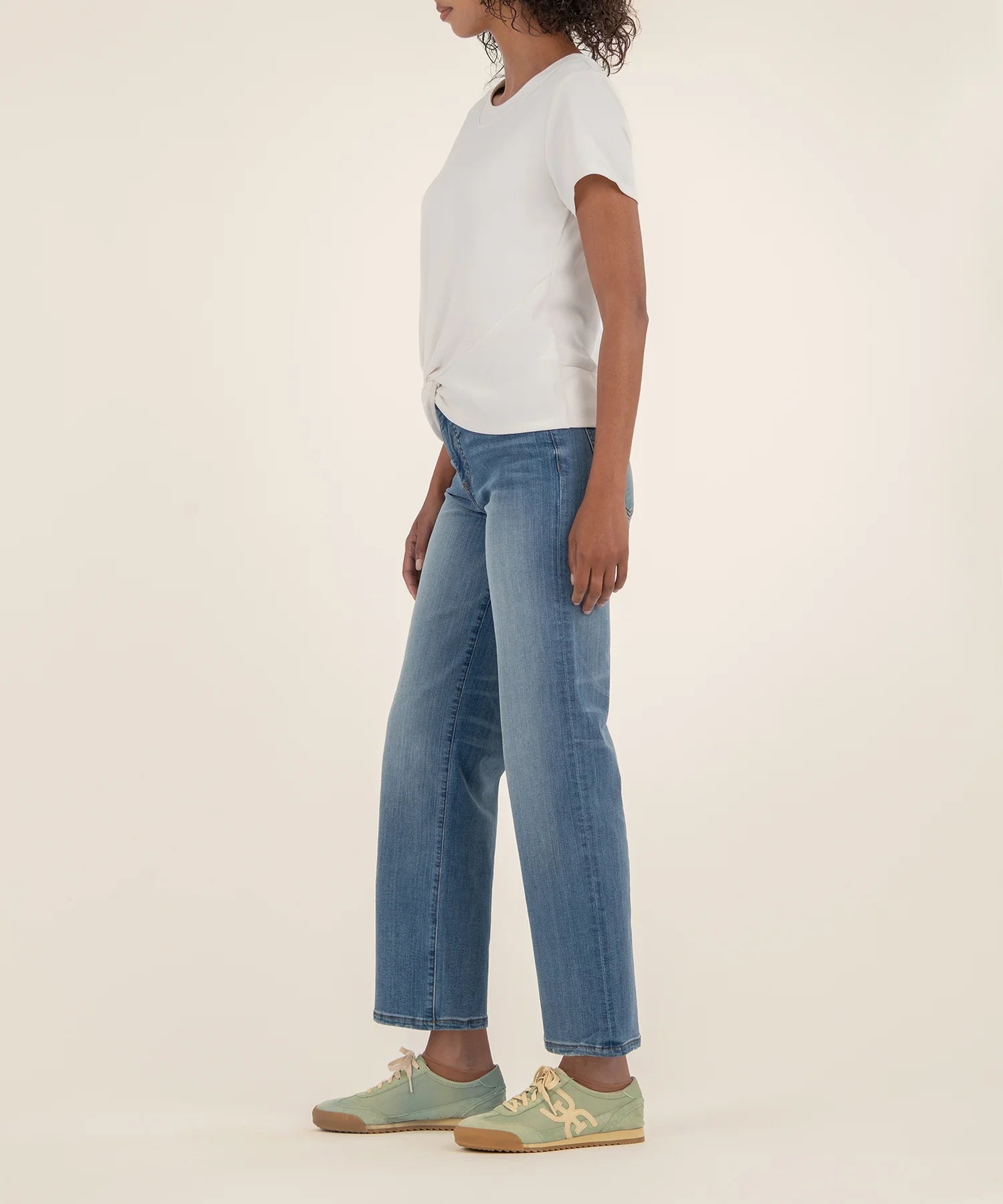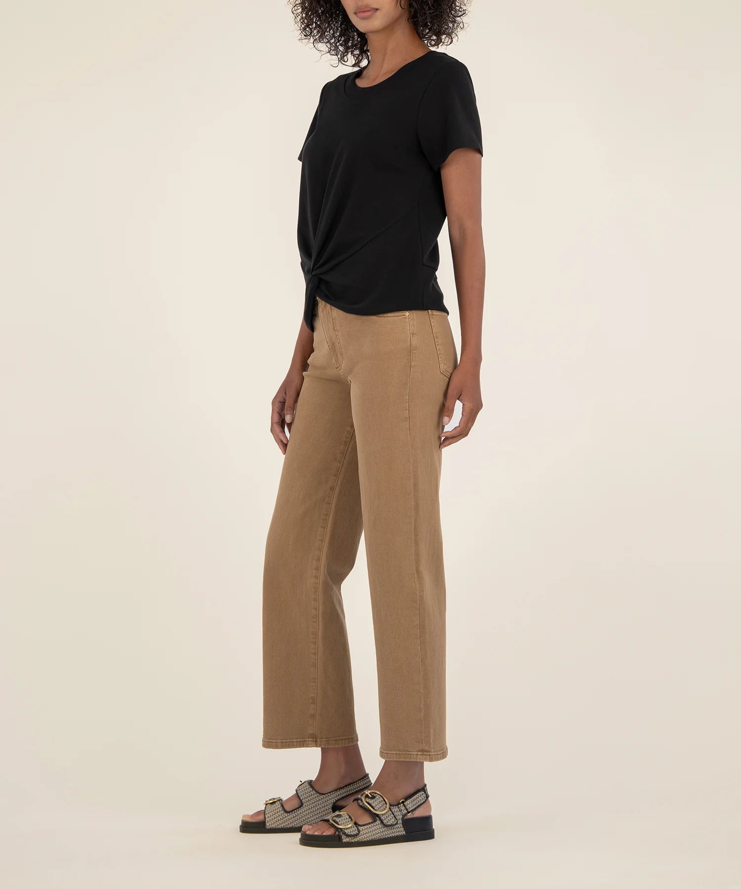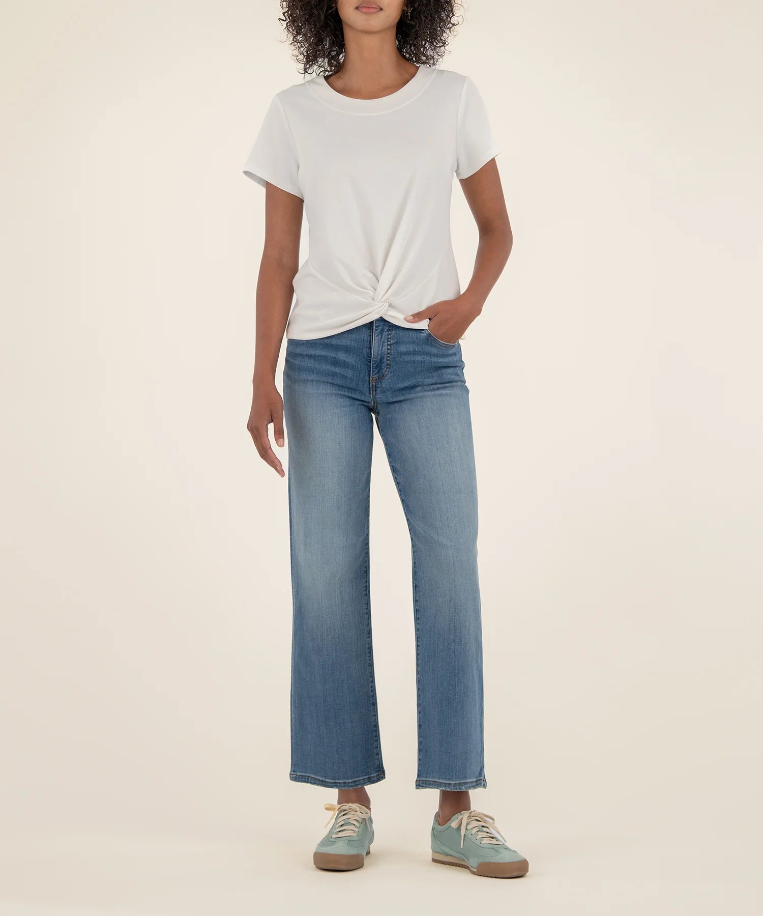 • Keep it casual and chic with this short sleeve crew neck tee, featuring a stylish front twist hem for a flattering, modern touch. Perfect for pairing with high-rise jeans or skirts for an effortless everyday look.