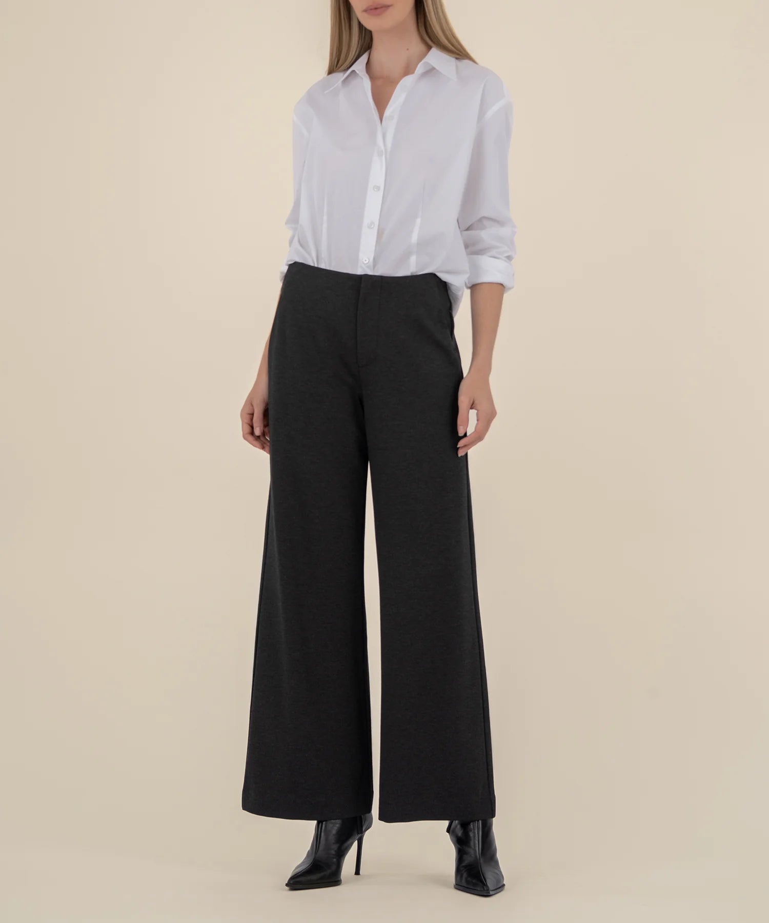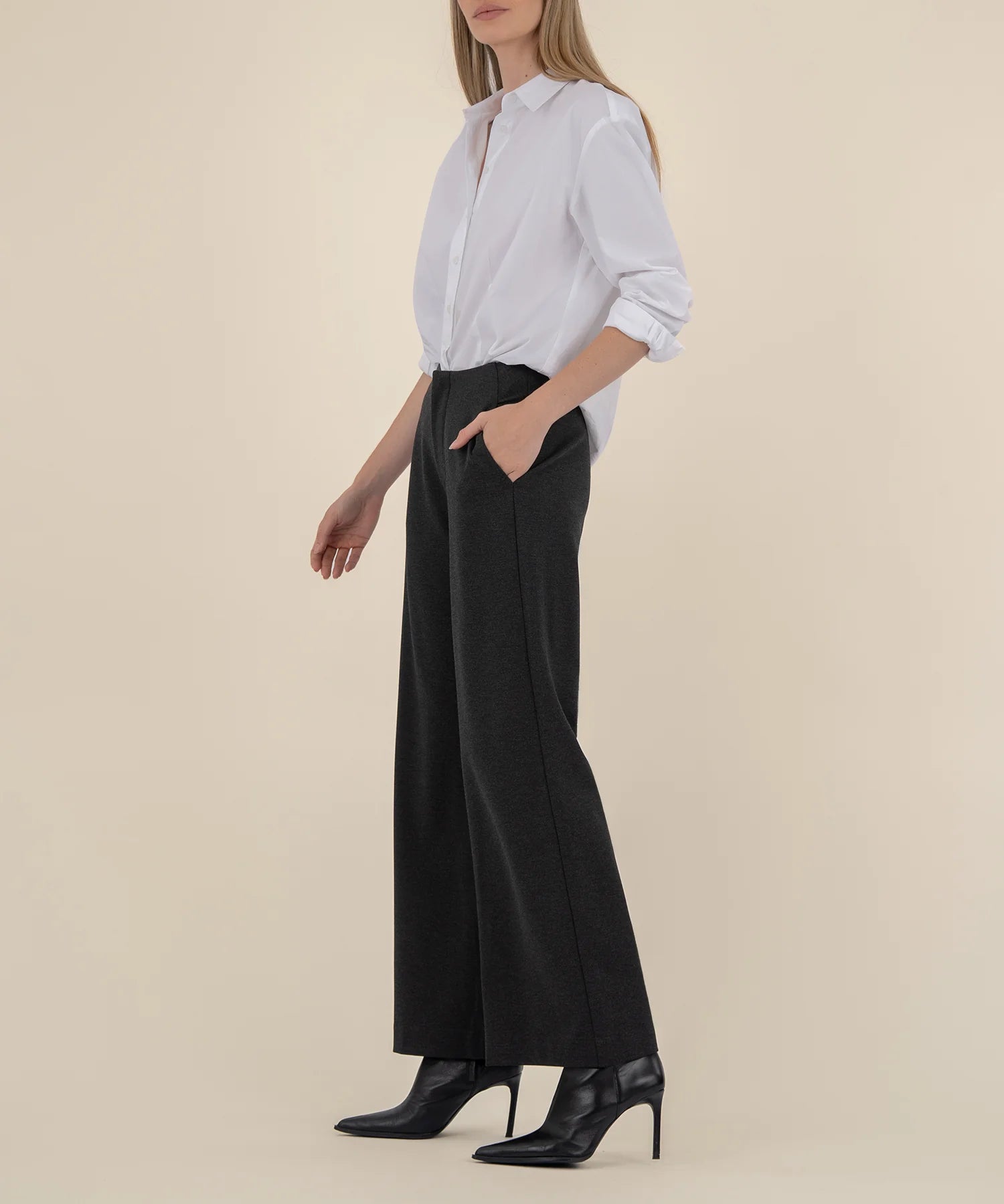 - These wide leg trousers offer a sharp, tailored look while providing all-day comfort with super stretchy material. Featuring classic trouser pockets, they effortlessly blend style and functionality.