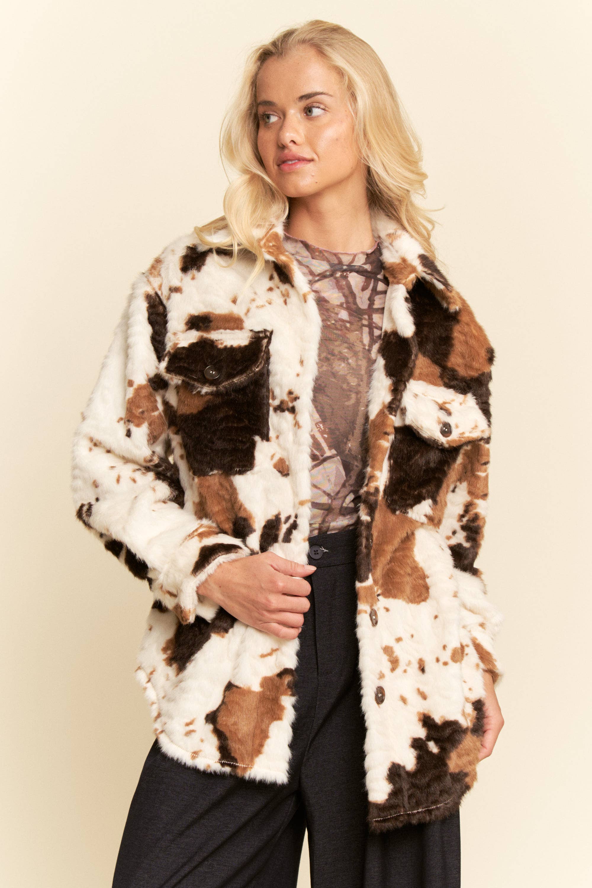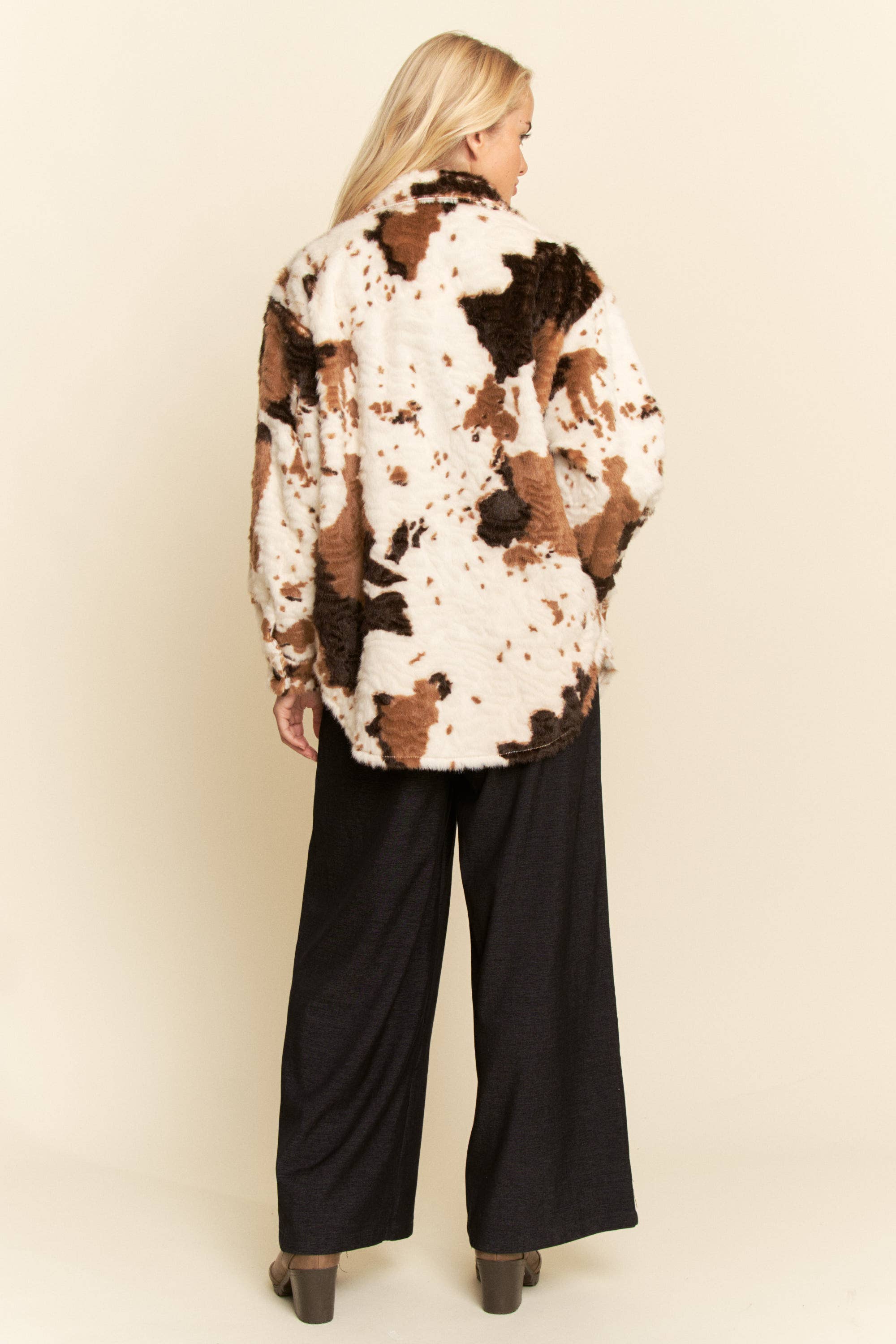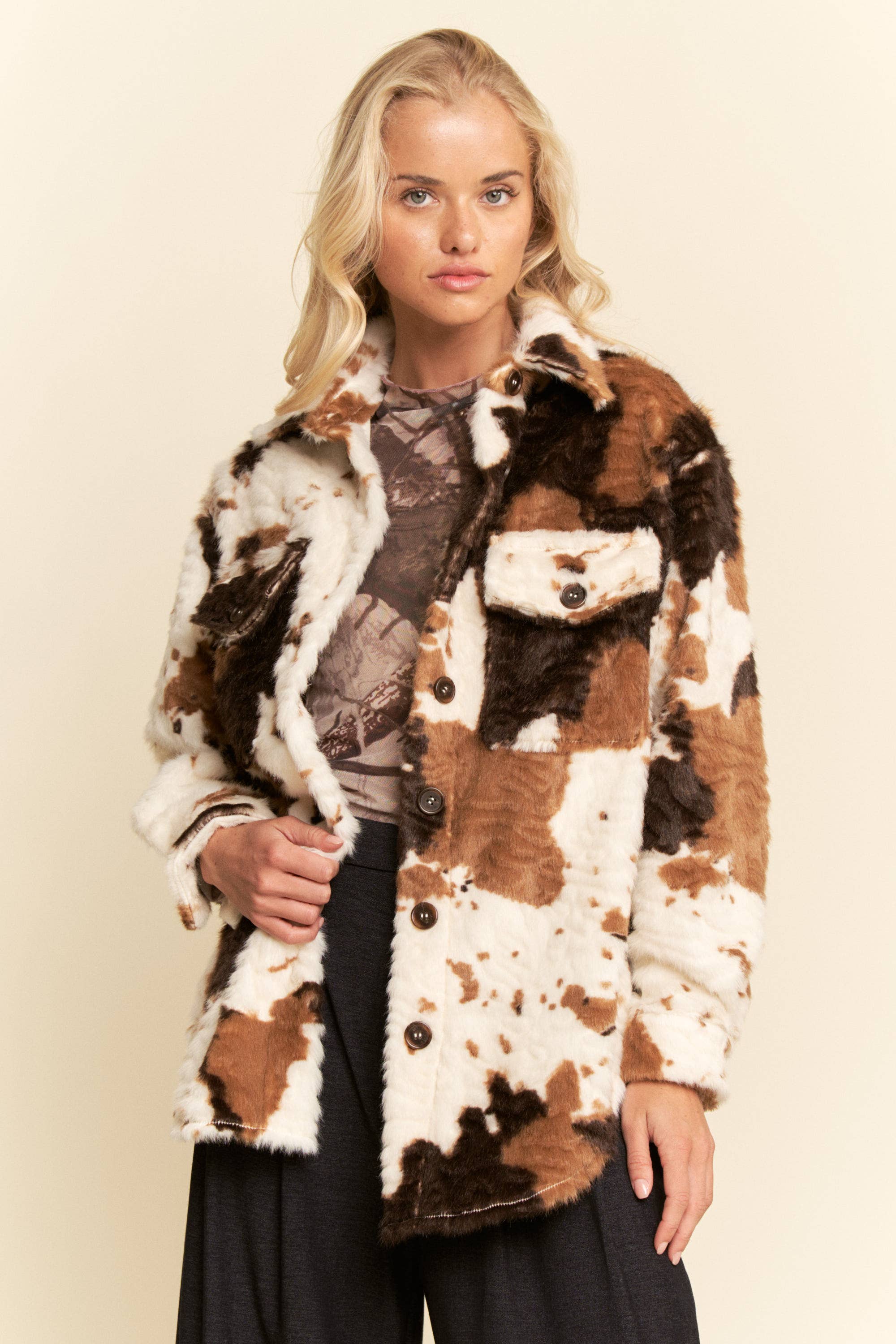 This shacket is your ticket to looking effortlessly cool—it's got that perfect mix of rugged edge and undeniable polish. Cowhide faux fur details frame the button pockets, giving you texture and attitude in one stylish package. Check out how our model wears it (Small, 5'10", 34" bust, 25" waist, 35" hips) and you'll see why this piece works over literally everything while keeping your vibe totally unforgettable.