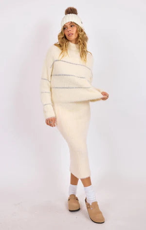 Elevate your sweater game with this chic turtleneck that's anything but basic. Featuring striking silver metallic stripes against a creamy ivory backdrop, it's the perfect blend of sophistication and shimmer. The cozy turtleneck keeps you warm while the metallic accents catch the light with every move, making you the star of any room. Whether you're dressing up for a night out or keeping it casual, this sweater brings just the right amount of sparkle to your everyday style.