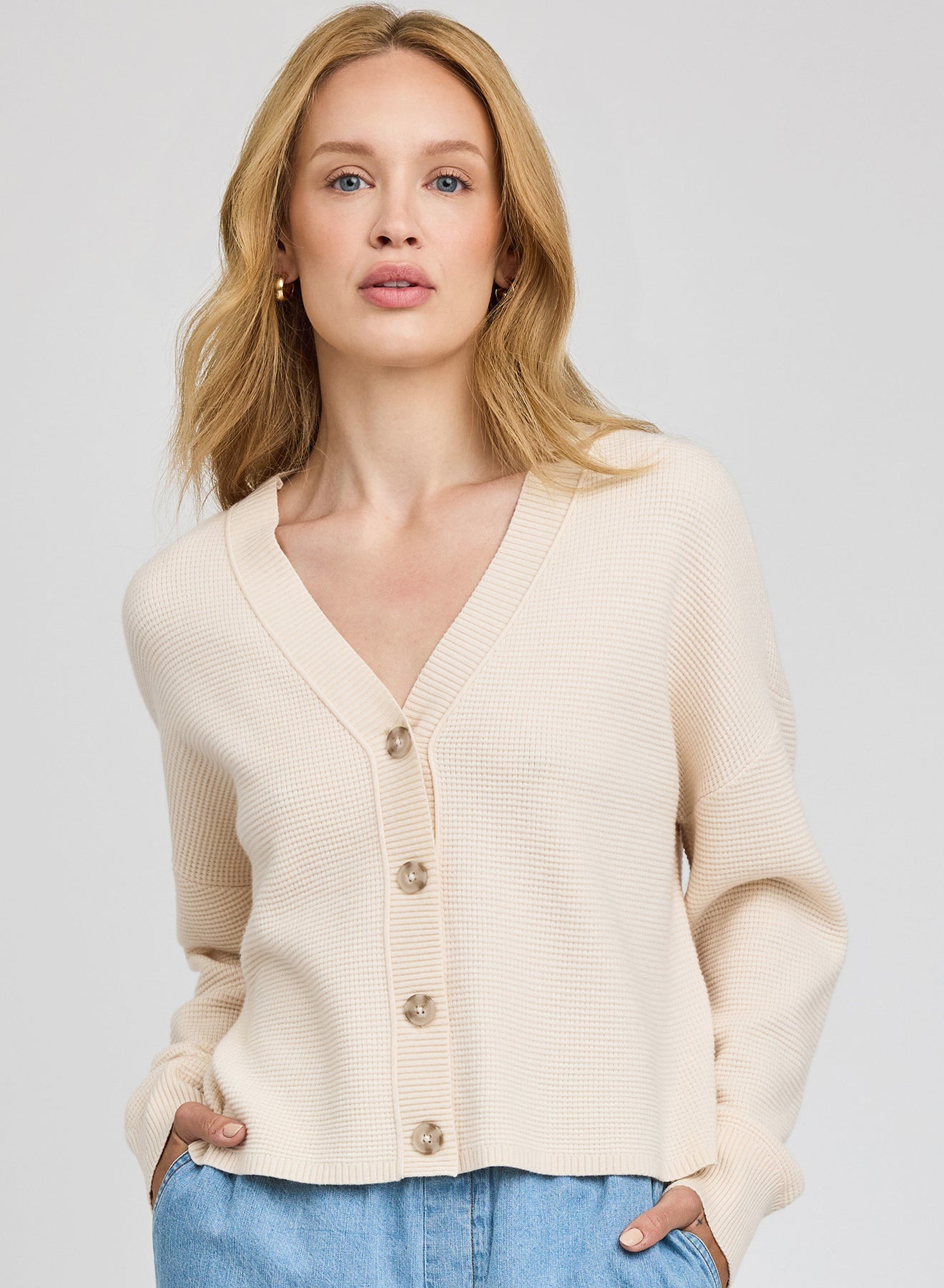 The Joyce cardigan is made of a soft yarn in a waffle stitch pattern. Features include a front button closure and exposed seam details.