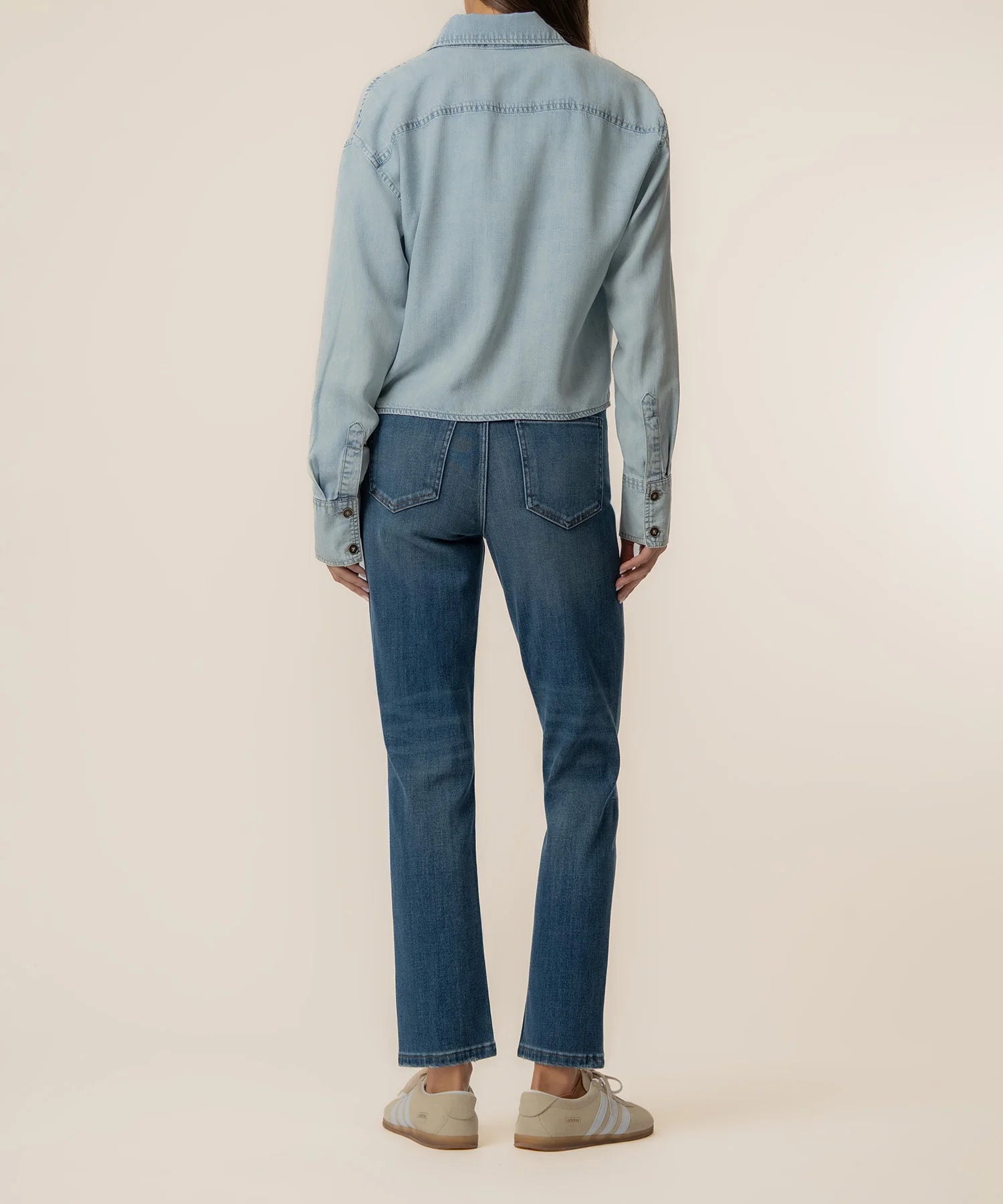 - This light wash denim shirt features a classic button front, long sleeves, and a functional pocket. An easy, versatile staple great for layering or wearing on its own.