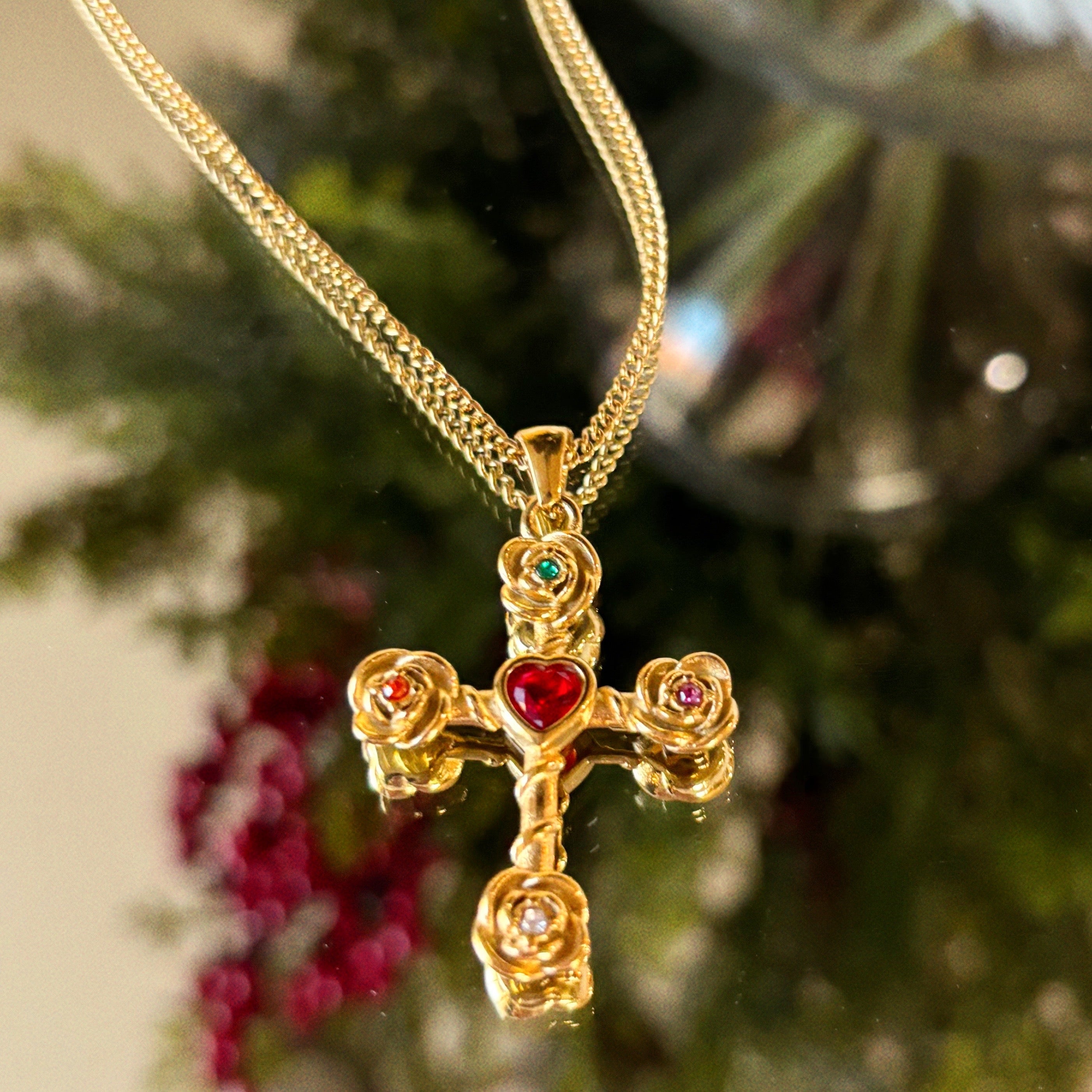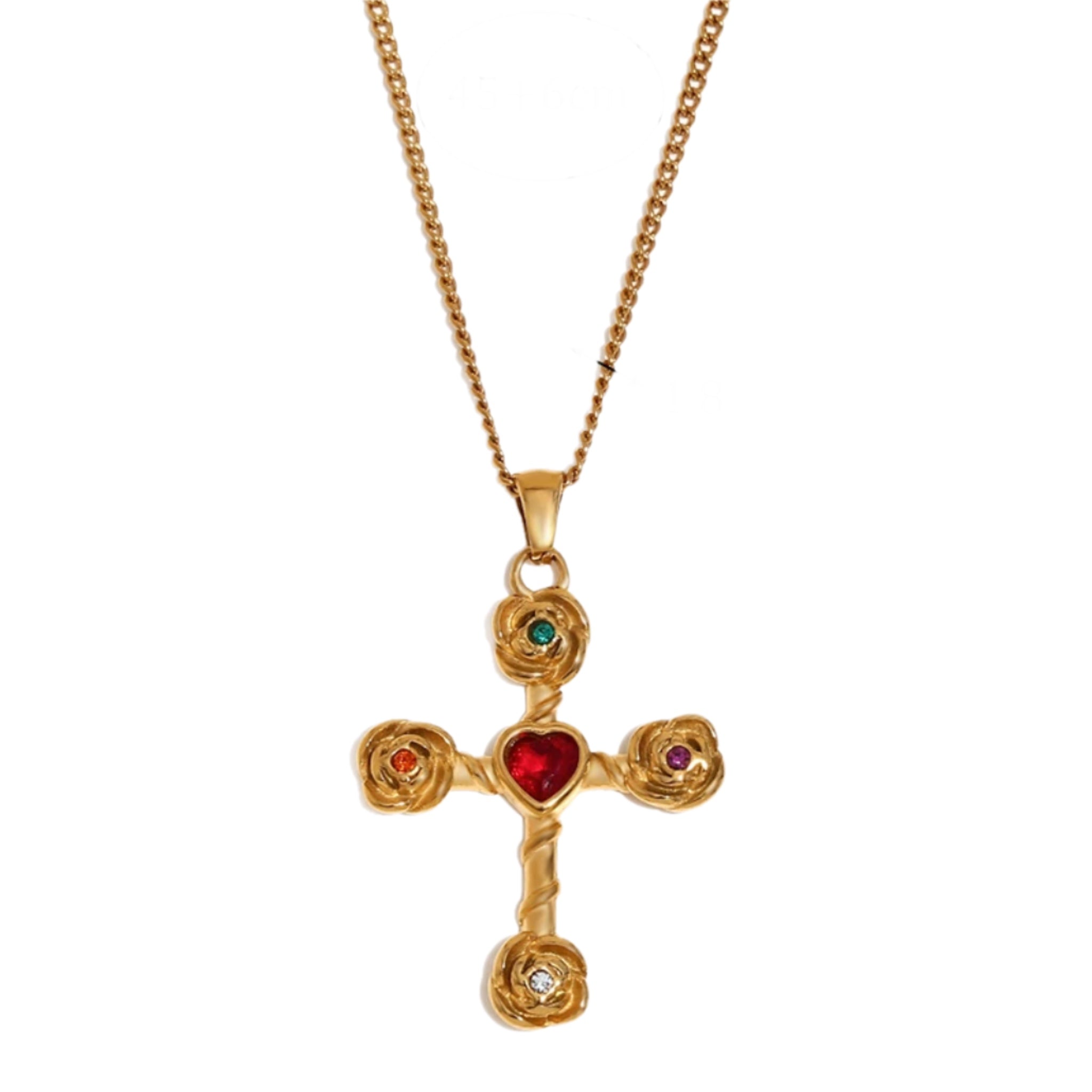 This striking cross pendant showcases an intricate floral and heart motif adorned with vibrant gemstones in a rich spectrum of hues. The oversized design makes a bold statement while the multicolored stone work adds depth and visual interest to this unique piece.