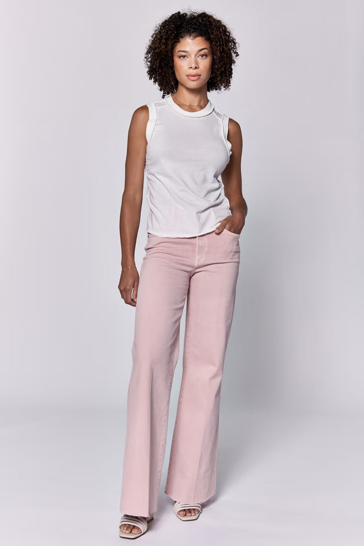 Raw edge tank, high neck finished sleeveless with banded neck & armhole, raw edge hem & center seam. Simplicity of comfort versatility, layering or casual, ready & go! Solid color knit on standard fit.