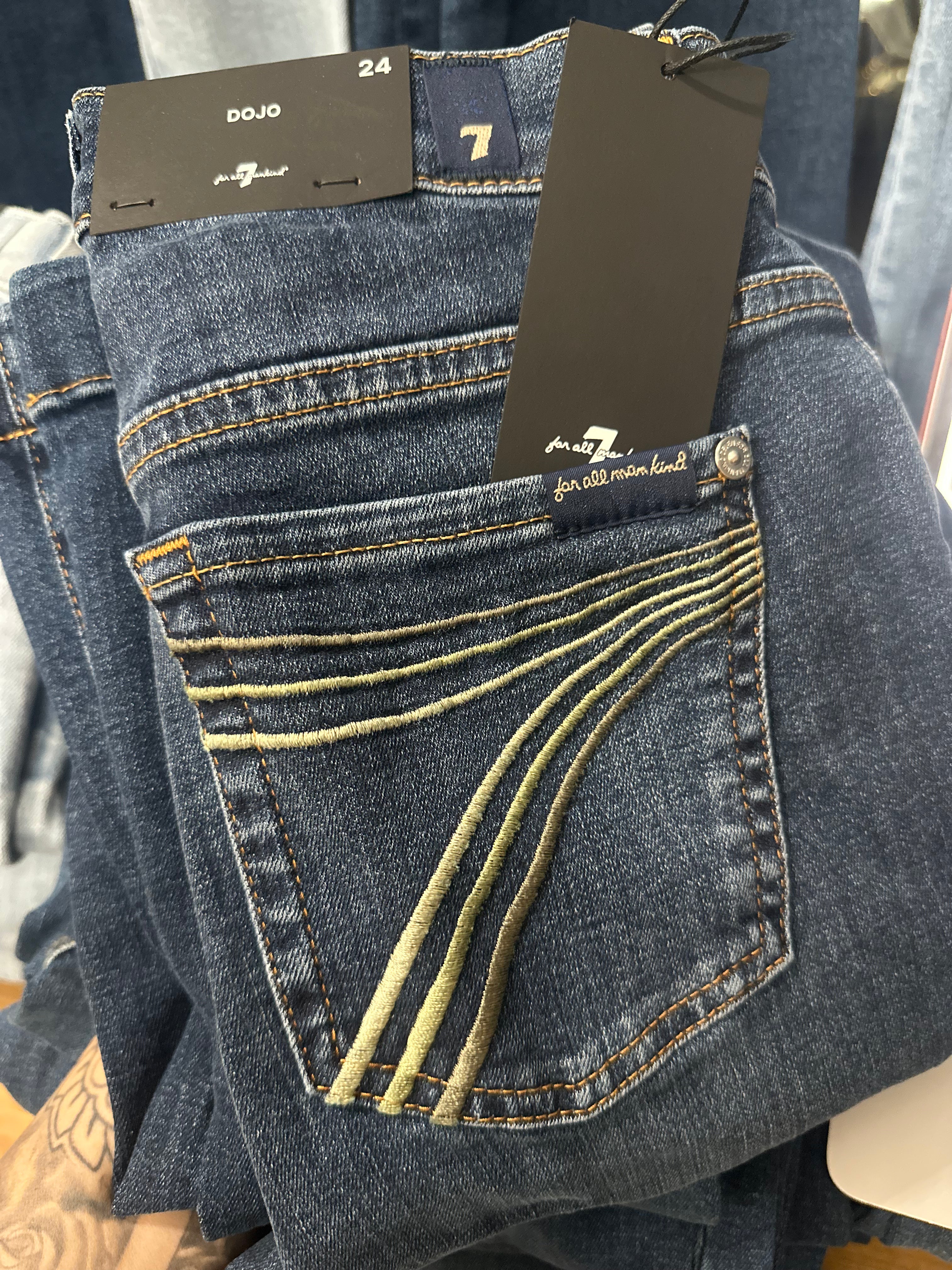 The 7 For All Mankind Boxford Dojo jean offers a refined fit through the hips and thighs, featuring a mid-rise silhouette with a wide, full-length leg and gentle flare that elongates the figure. Crafted from authentic denim with a subtle stretch, this medium blue wash provides both comfort and style. The back pockets showcase elegant green ombré embroidery, adding a distinctive touch to this sophisticated denim essential.