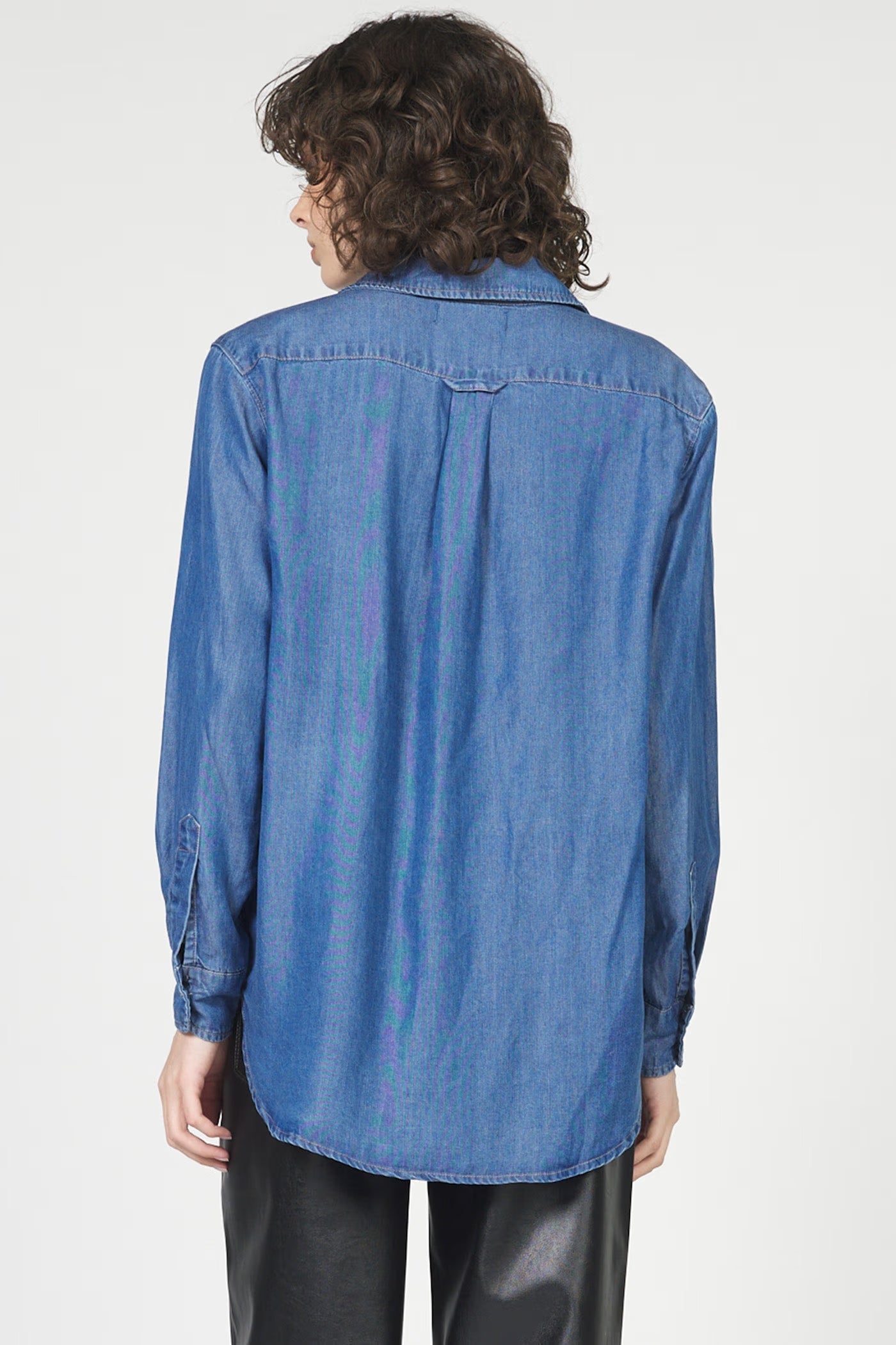 Galina tuxedo ruffles button-up featuring a sophisticated design crafted from 100% Tencel™ for an elegant and versatile look.
