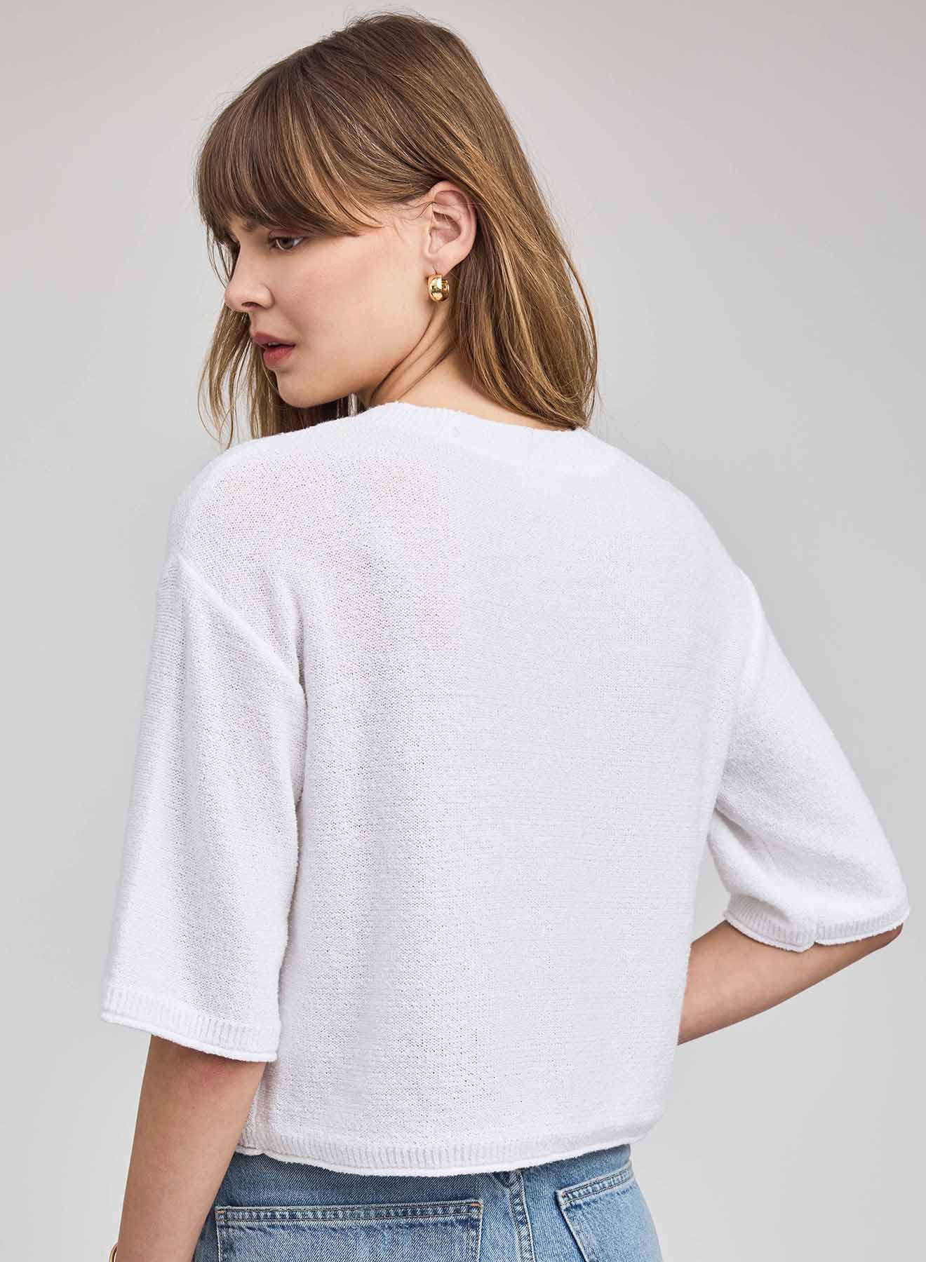 The Genevieve cardigan is made of a cotton blend yarn with a slub effect in a reverse jersey stitch. Features include a front button closure and rolled hem details.
