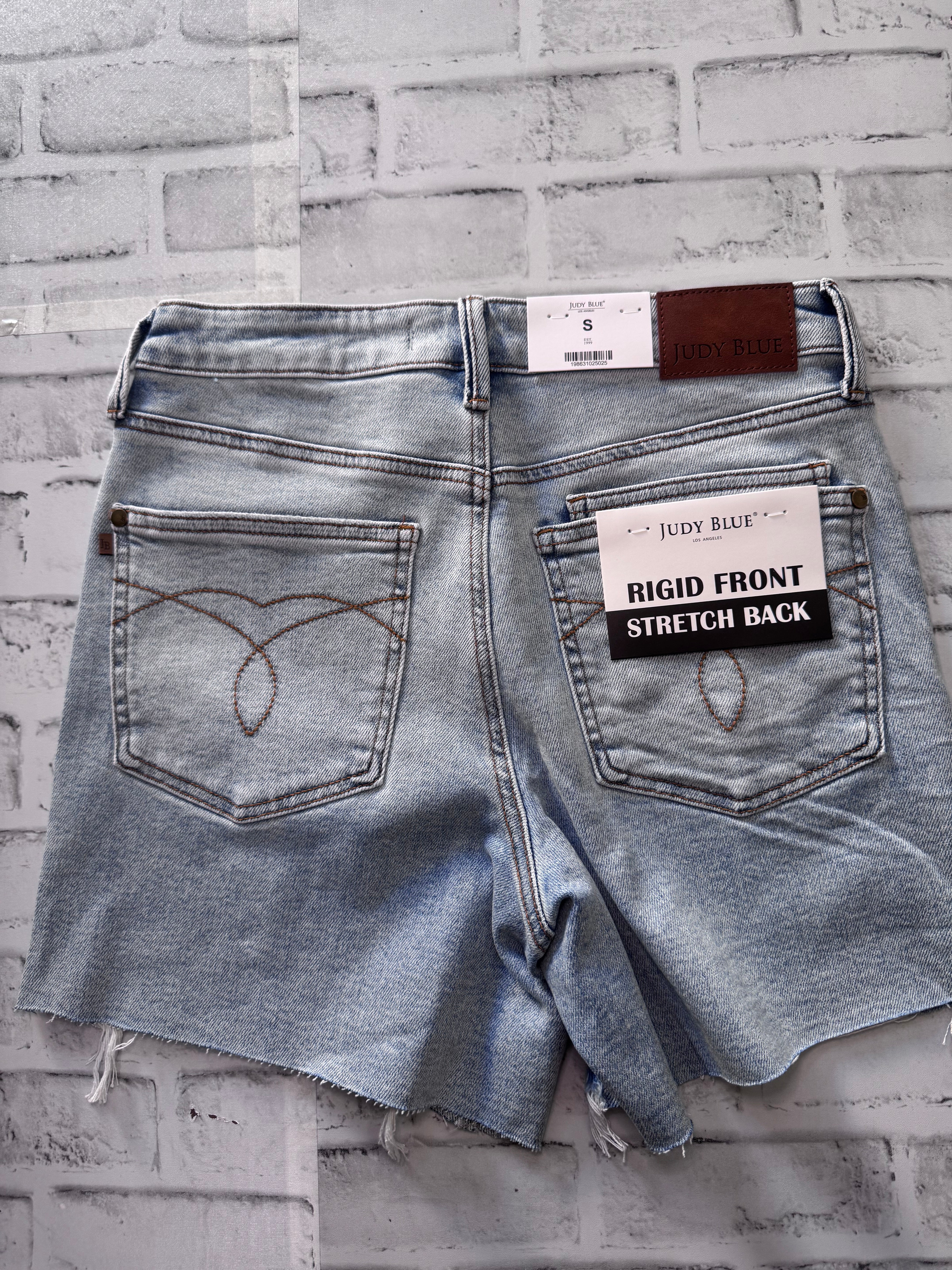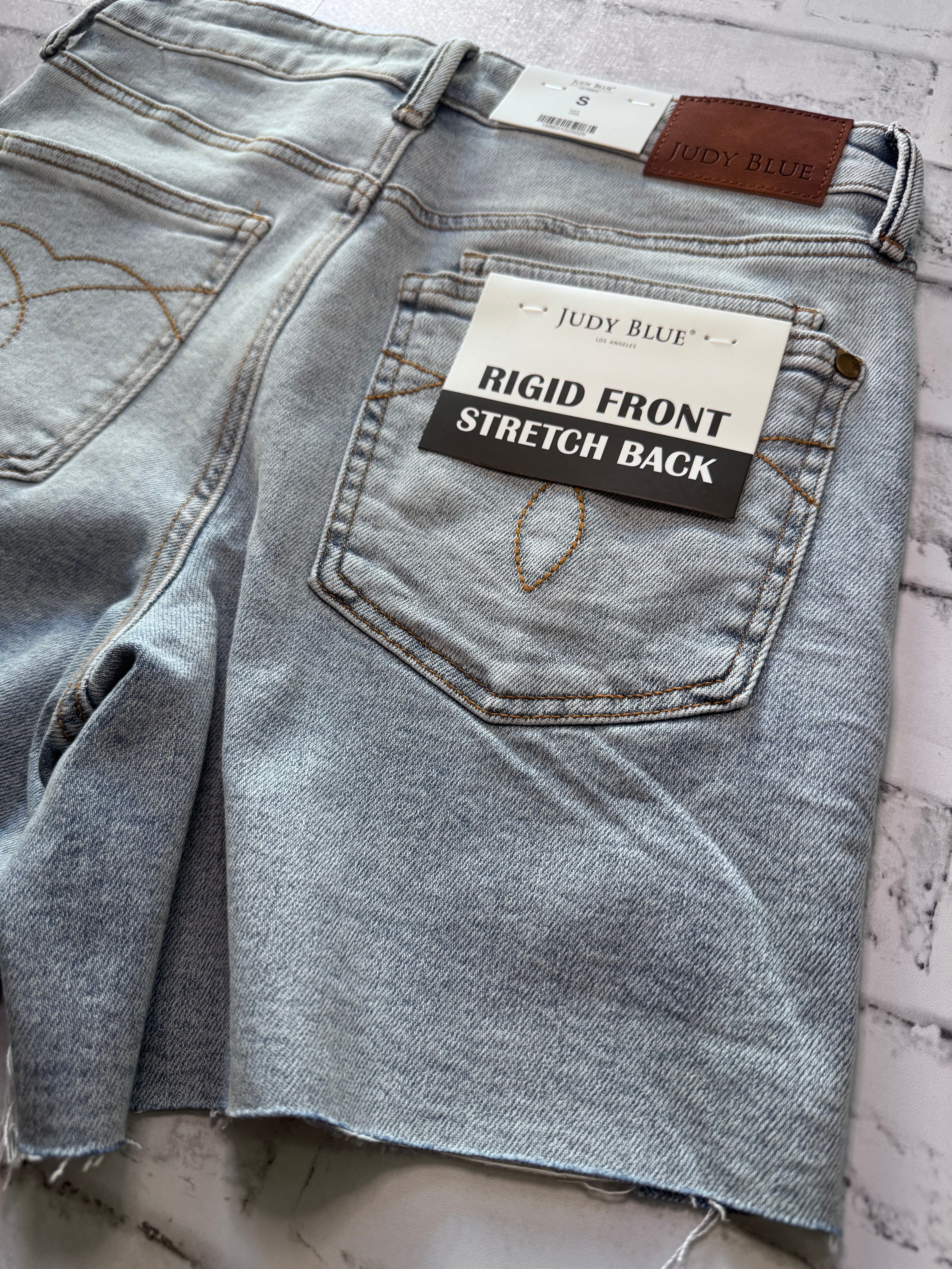 The Judy Blue Magic Dad Shorts, model 150364, feature a practical double pocket design, enhancing functionality for everyday wear. Constructed with durable materials, these shorts provide comfort and versatility, making them suitable for various activities. The design ensures a relaxed fit, promoting ease of movement throughout the day.