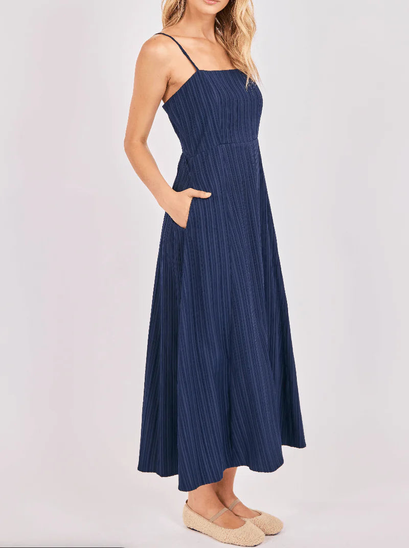 The Junibelle Fit & Flare Maxi Dress offers an effortless balance of ease and elegance. The soft, textured fabric features a subtle vertical stripe that elongates the silhouette, while the fitted bodice and gently flared skirt create a naturally flattering shape. Adjustable spaghetti straps and a smocked back ensure a comfortable, customizable fit. Side pockets add a practical touch, making this dress as functional as it is refined.