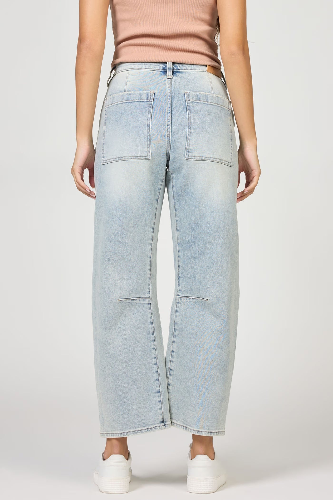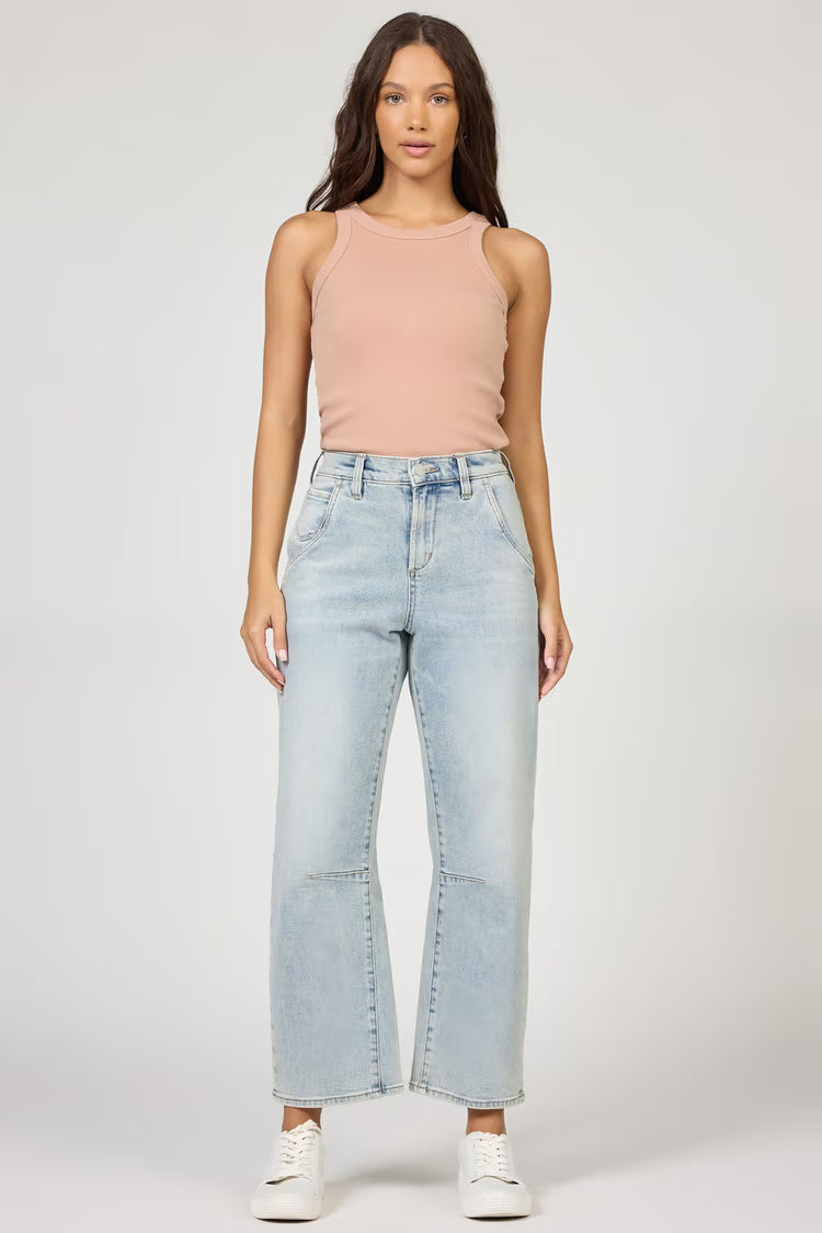 Introducing the high rise clear stream lasso jeans featuring a clean hem and a trendy barrel leg design.