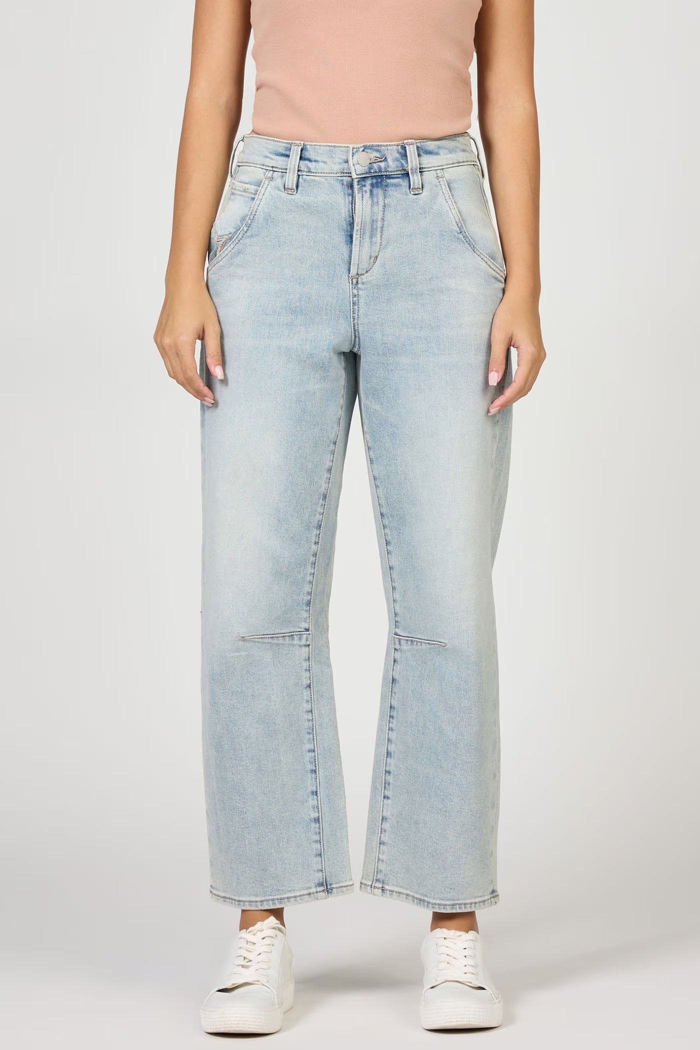 These light wash denim jeans offer a flattering cropped silhouette, allowing you to effortlessly showcase your favorite footwear.