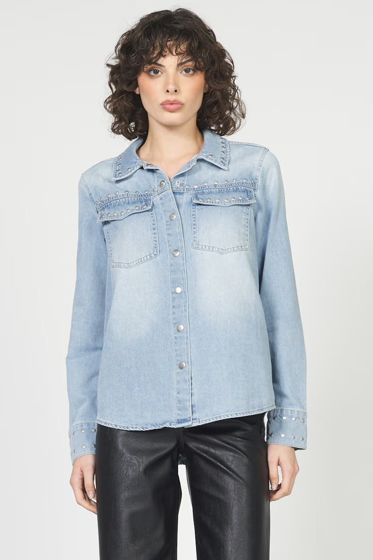 Star denim shirt in long sleeve featuring patch pockets and metal stud detail.