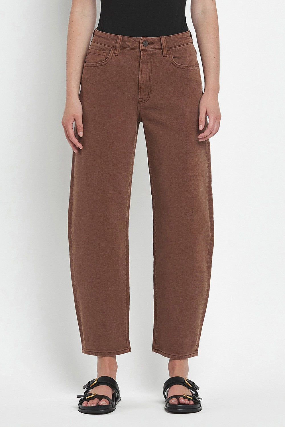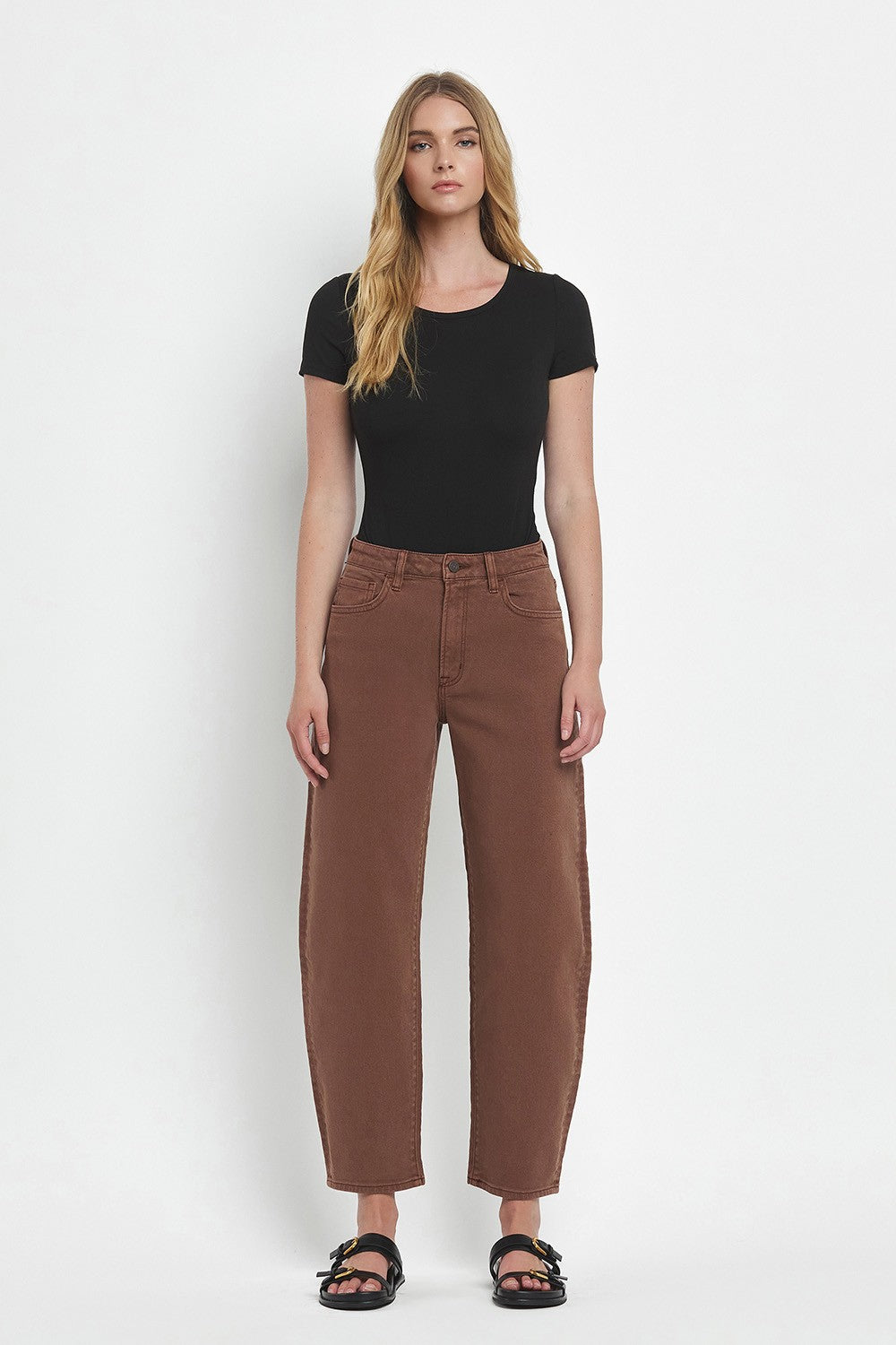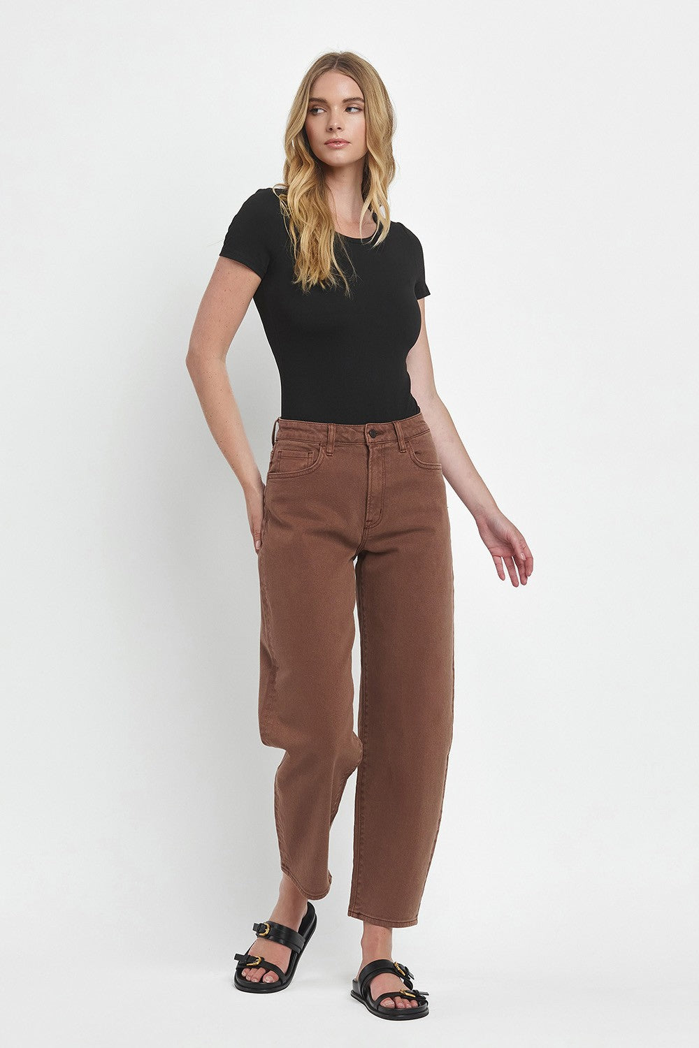 These Super High Rise Brown Slim Barrel Jeans are crafted from comfortable stretch denim featuring a super high-rise waist and a refined finished hem. With a cropped length offering an inseam of 27 1/2", a rise of 11", and a leg opening of 14 1/2", they provide a sleek and modern silhouette. The model, standing 5'10", wears size 26, showcasing the flattering fit of these elegant slim barrel jeans.