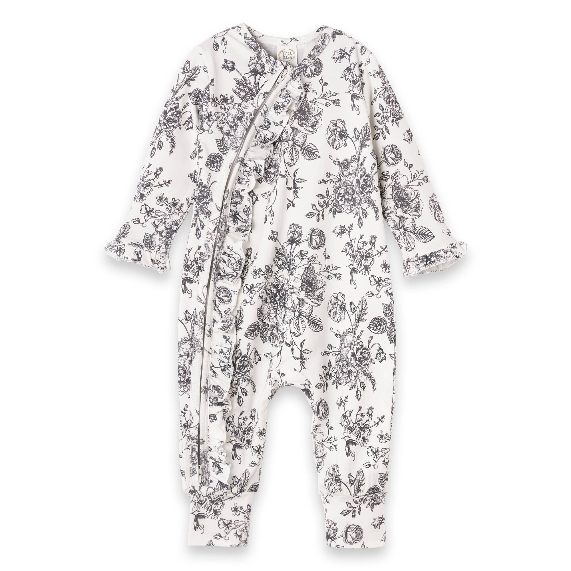 This super soft baby girls' zipper romper, made from a bamboo/cotton/spandex blend, features a charming floral toile print and handy zipper for quick changes, with a neck guard for extra protection. Sweet zipper ruffles add a touch of flair. Cozy, absorbent, hypoallergenic, and eco-friendly. Machine wash warm and tumble dry low.