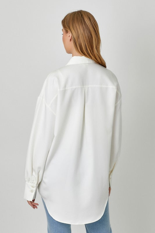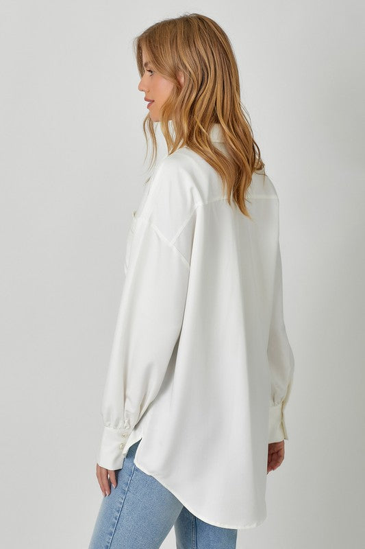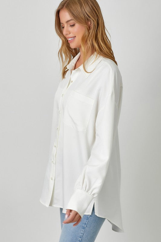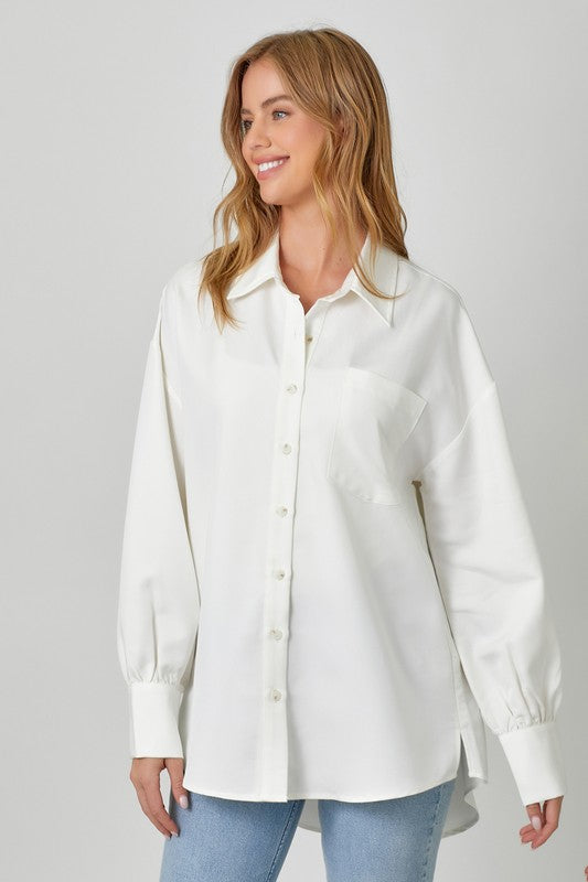 Slip into effortless cool with this oversized button-up that's got serious personality. A functional bust pocket keeps things practical, while bubble sleeves add that unexpected flair. The hi-lo hem and side slits give you movement and style in one breezy package. Crafted from a rayon and polyester blend that feels as good as it looks. Our model (5'9") rocks it in a small—proof that one size fits that boyfriend-shirt vibe perfectly.