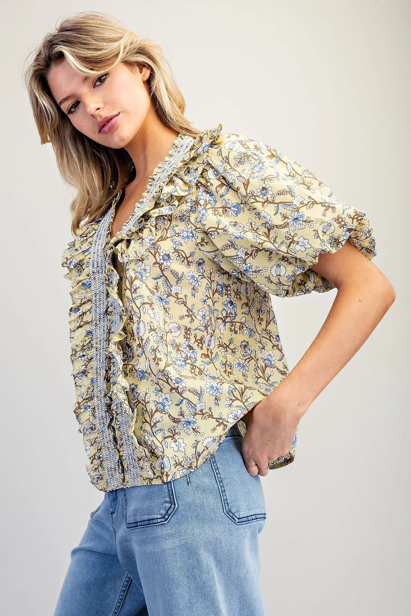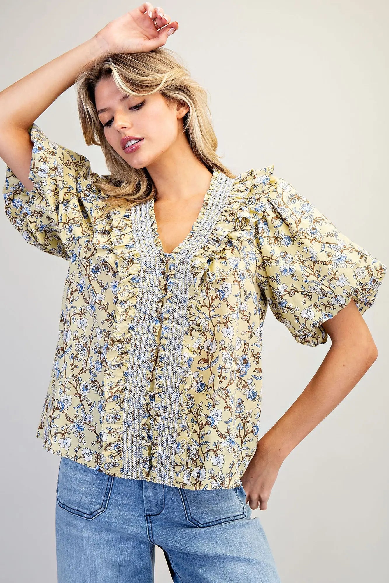 The Lemon Grass Top brings effortless elegance with its romantic silhouette. Featuring a flattering V-neckline accented with smocked detailing and cascading front ruffles, this piece combines vintage-inspired charm with modern comfort. Voluminous puff sleeves and a relaxed fit create movement and dimension, while the delicate floral print adds visual interest. Crafted from a breathable cotton-rayon blend, it transitions seamlessly from casual daytime wear to evening occasions. Model is 5'8" wearing size small.
