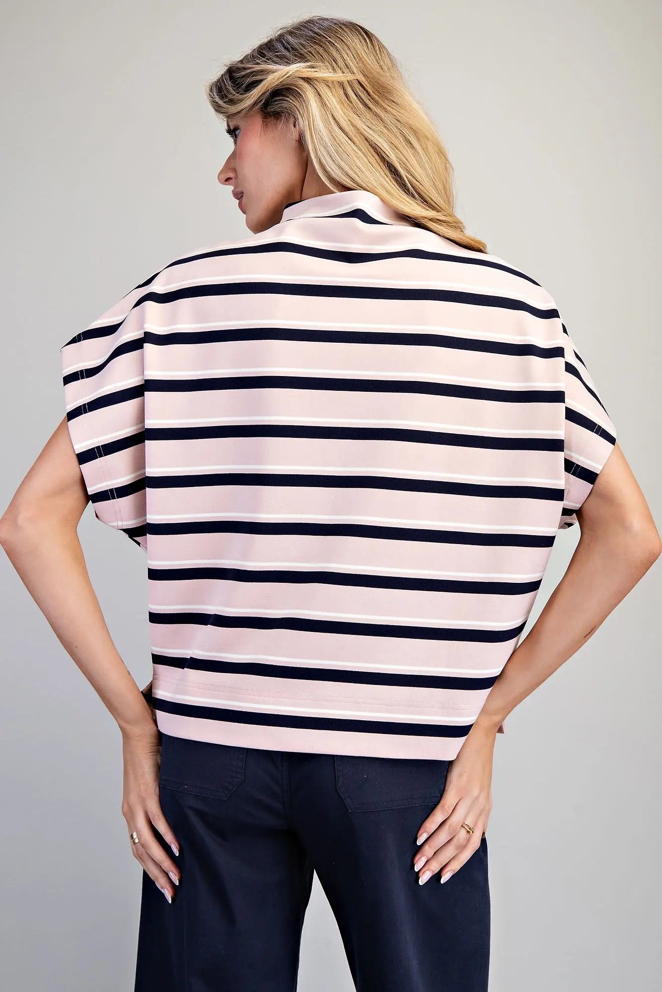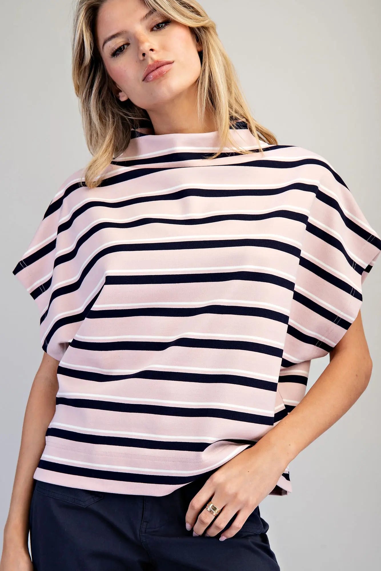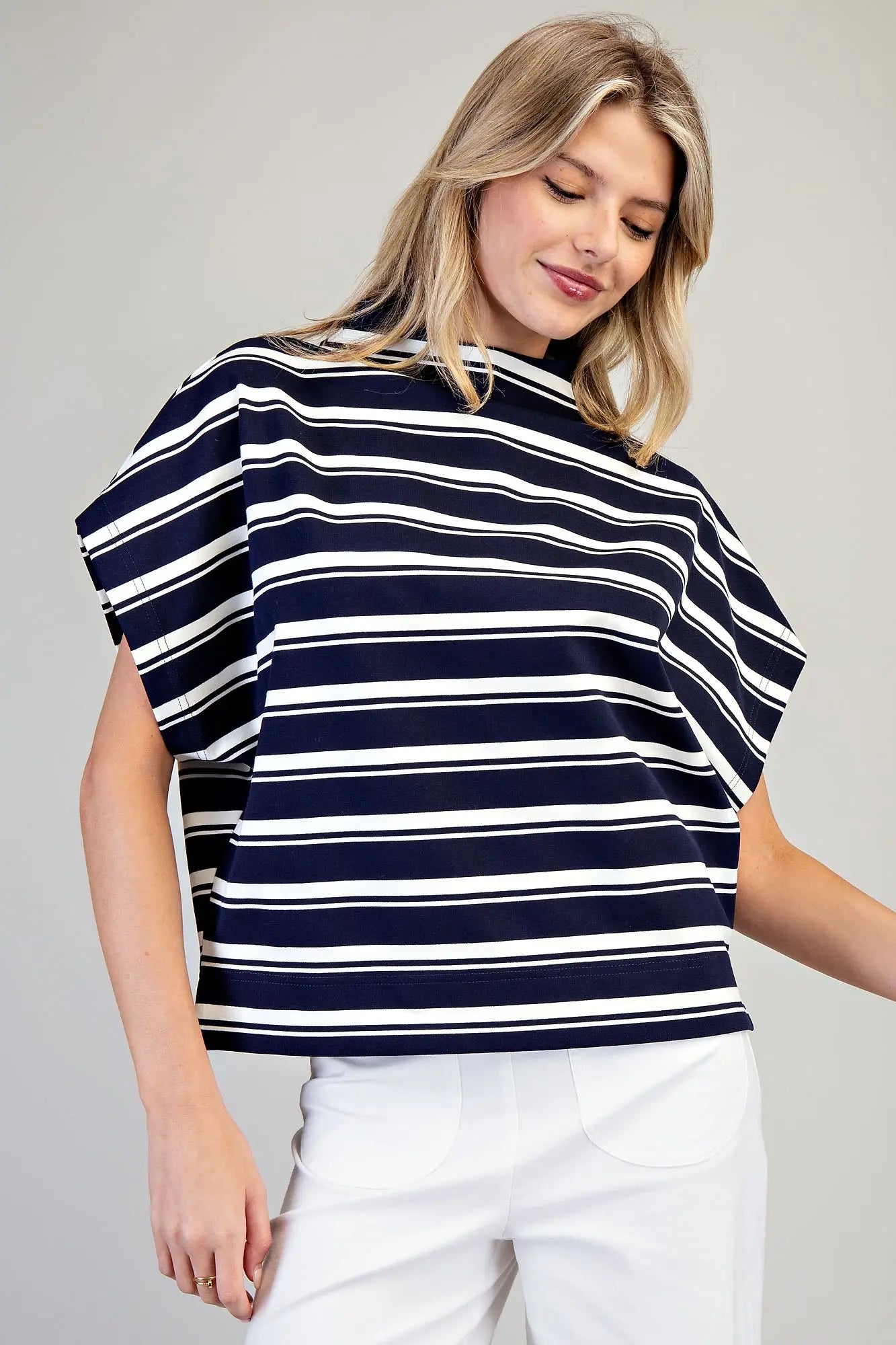 The Lucy everyday Stripe brings effortless French-inspired style to your wardrobe rotation. This short-sleeve top features a relaxed boxy silhouette with dropped shoulders and a wide mock neckline that feels both casual and put-together. Bold horizontal stripes add visual interest and pair seamlessly with everything from linen shorts to tailored trousers. Crafted from a breathable blend of 65% rayon, 30% nylon, and 5% spandex, the fabric drapes beautifully while maintaining its shape through wear and wash. The generous cut and soft construction make it perfect for layering or wearing solo on warmer days. Whether you're heading to brunch or running errands, this striped essential delivers that coveted Parisian ease without trying too hard. Model is 5'8" and wearing a small.