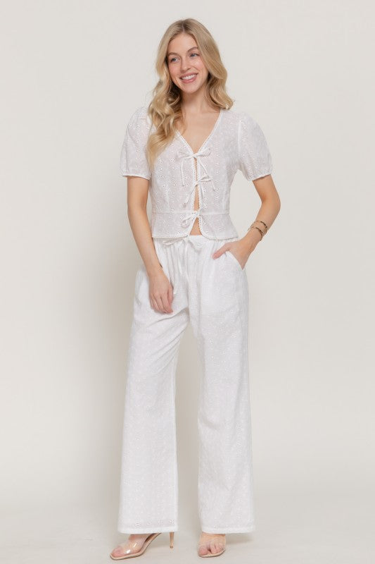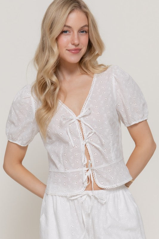 The Maren is a charming short-sleeve top crafted from 100% cotton eyelet fabric. A delicate front tie detail adds feminine appeal and adjustable styling options. The breathable cotton construction makes it perfect for warm weather, while the eyelet texture brings subtle visual interest. Versatile enough for casual outings or dressed up for special occasions.