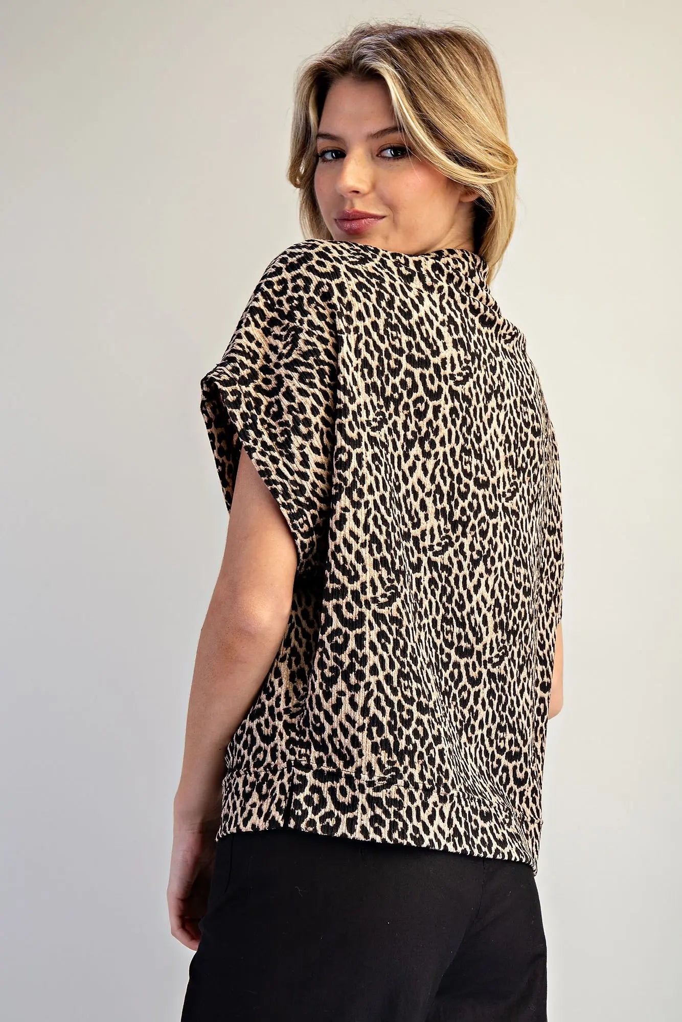 Effortlessly chic, The Reign Leopard Top delivers contemporary style through its signature mock neck and flowing dolman sleeves. The animal-print design pairs a relaxed, draped silhouette with modern sophistication—enhanced by subtle side slits and a gently banded hem that keeps the look polished. Crafted from a breathable polyester-spandex blend, this versatile piece moves with you while maintaining its shape. Model wears size small at 5'8". Imported.