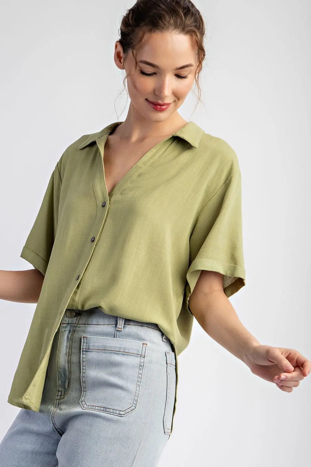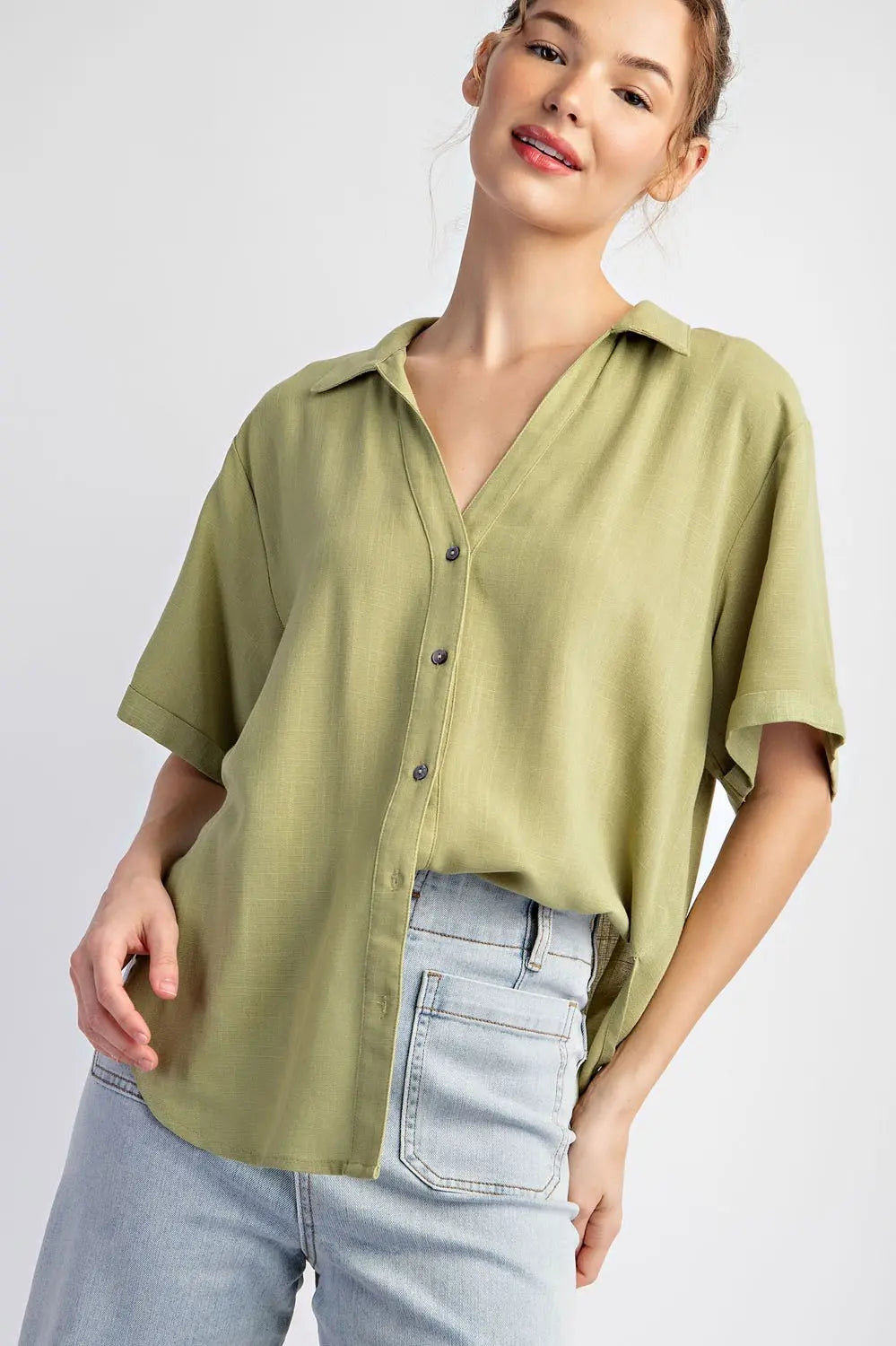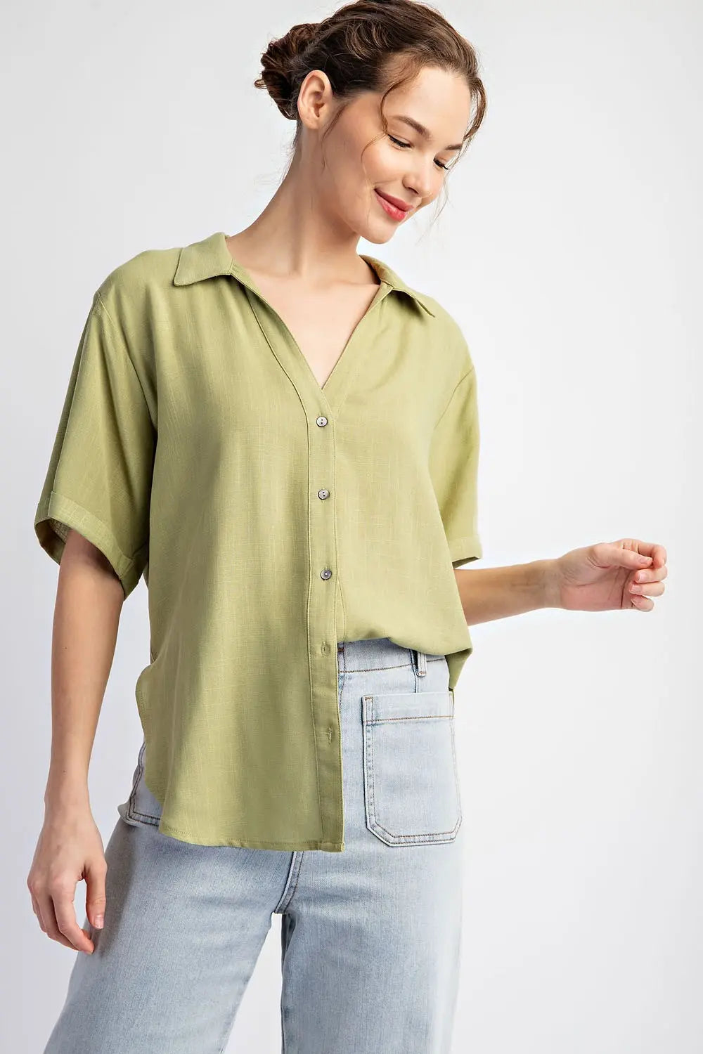 Effortless elegance meets everyday comfort in this breezy V-neck button-down blouse. Crafted from lightweight rayon, it features a crisp collar, front button closure, and a clever back pleat that adds dimension without fuss. The rounded hem creates subtle side slits for easy movement—perfect for layering or wearing solo. A versatile wardrobe staple that transitions seamlessly from casual to polished.