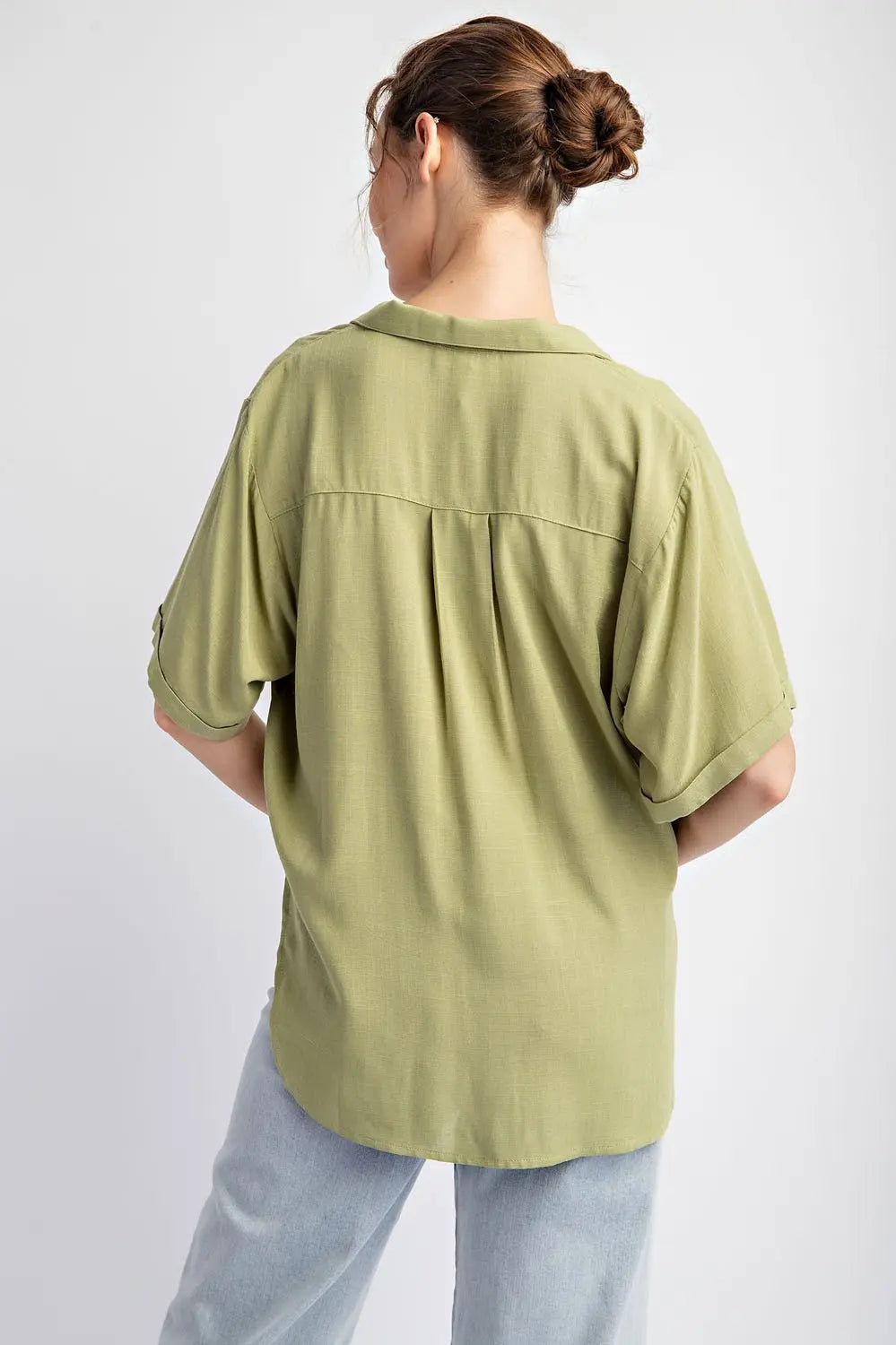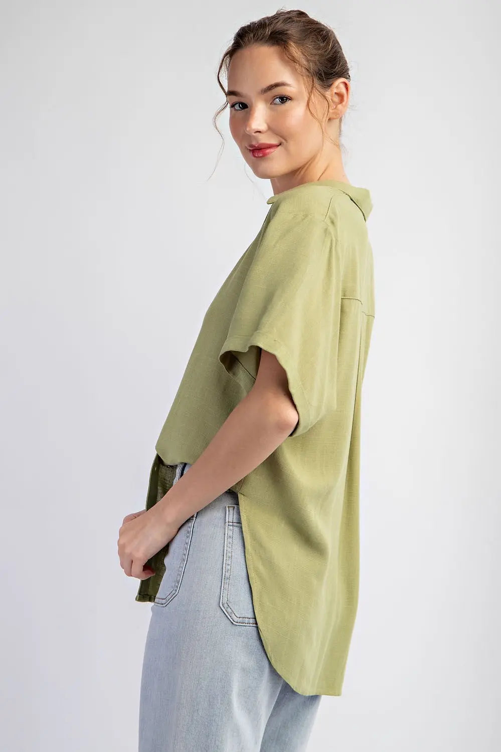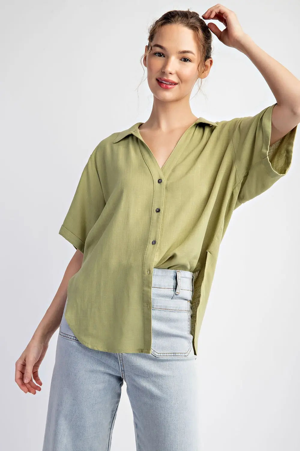 Effortless elegance meets everyday comfort in this breezy V-neck button-down blouse. Crafted from lightweight rayon, it features a crisp collar, front button closure, and a clever back pleat that adds dimension without fuss. The rounded hem creates subtle side slits for easy movement—perfect for layering or wearing solo. A versatile wardrobe staple that transitions seamlessly from casual to polished.