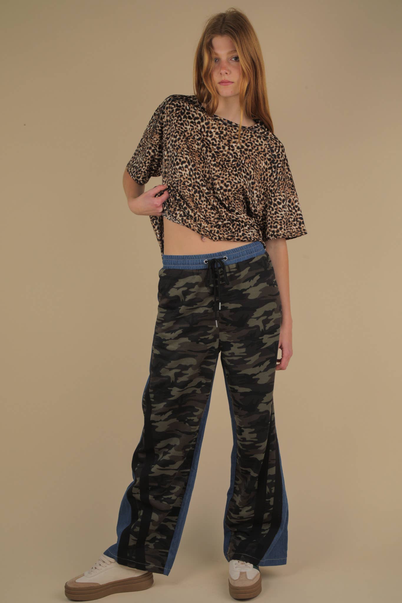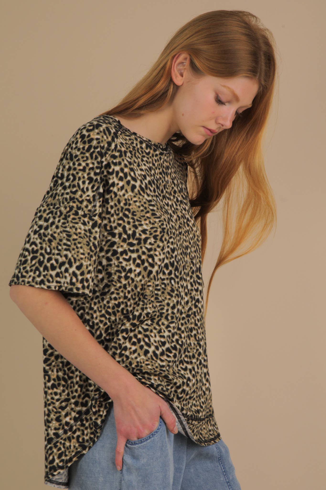 The Olivia Oversized Knit Top features a sophisticated leopard print with a relaxed round neckline and dropped shoulders. It offers short sleeves and a rounded hem with raw edge accents for a stylish, effortless look. Crafted from a blend of 95% polyester and 5% spandex, it combines comfort with a modern silhouette. (Model is 5'10" and wearing size Small