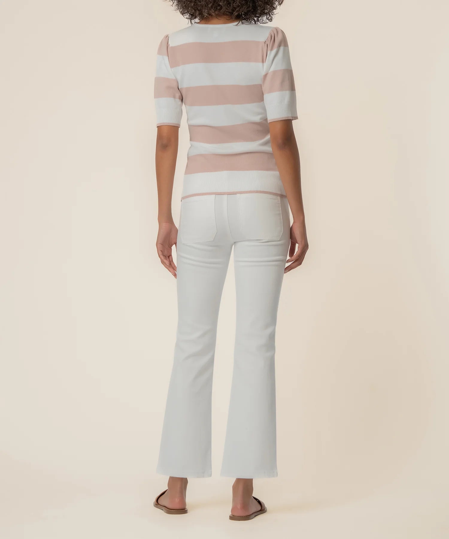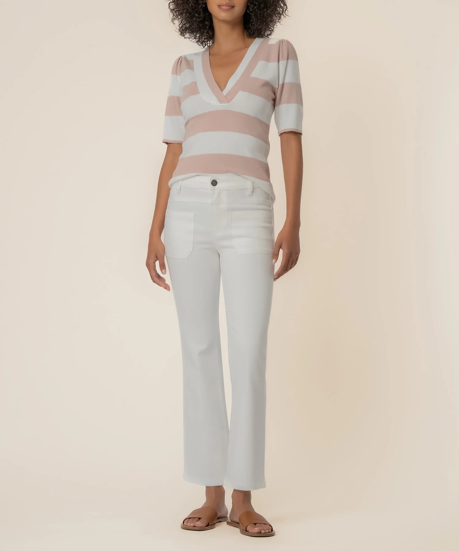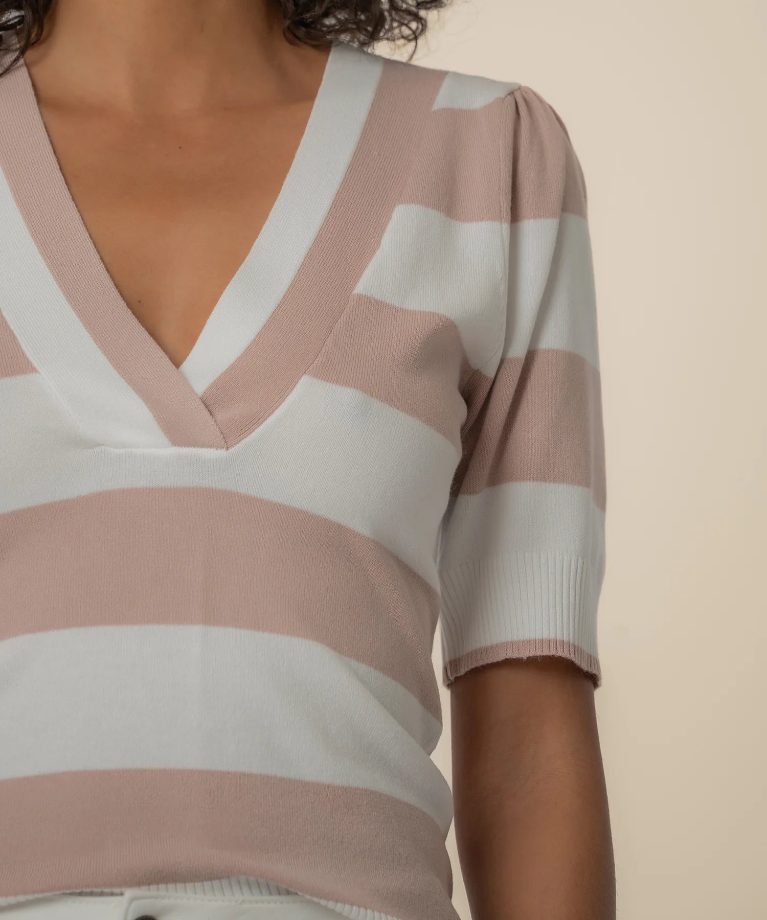 - This striped sweater features short sleeves and a flattering deep V-neckline for an easy, modern look. Made from stretchy, soft material, it’s comfortable, versatile, and perfect for everyday wear.