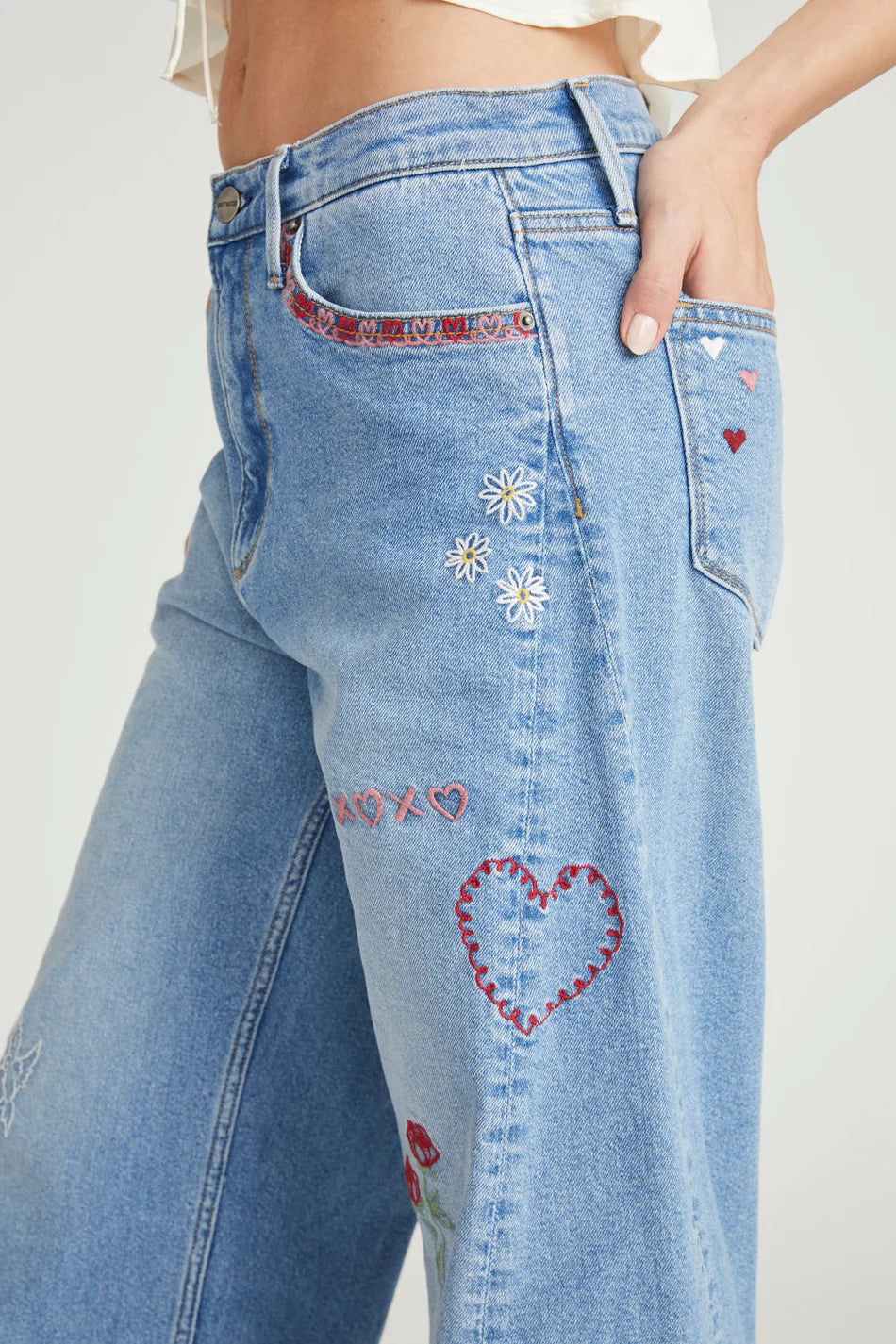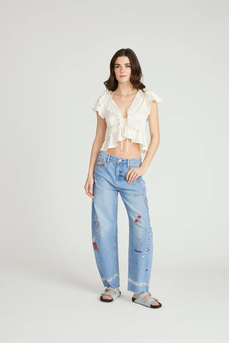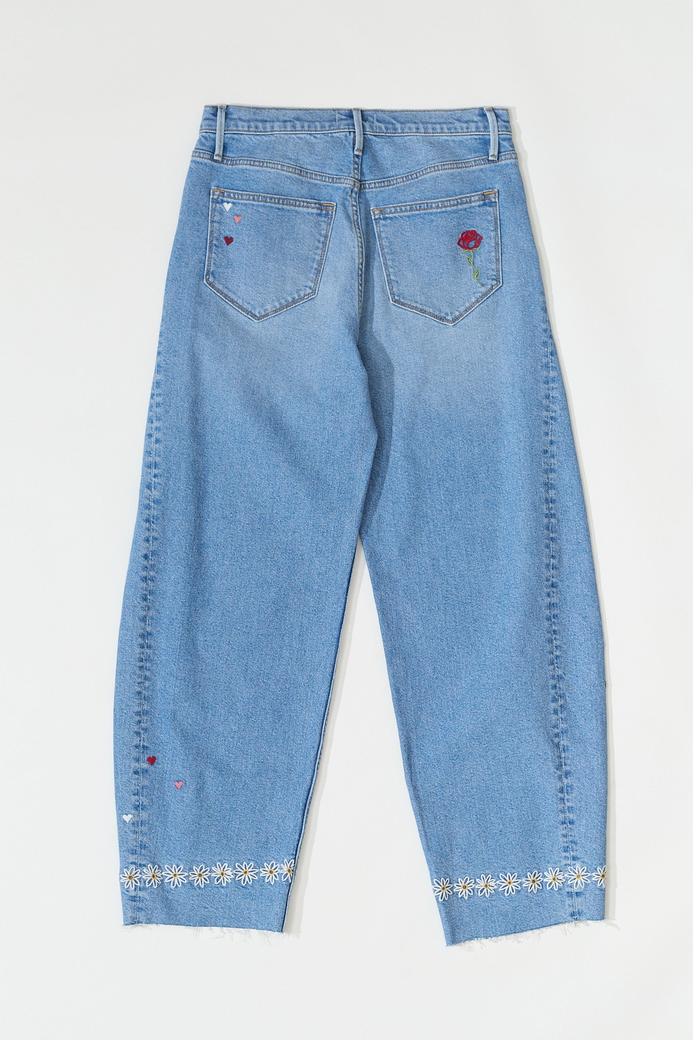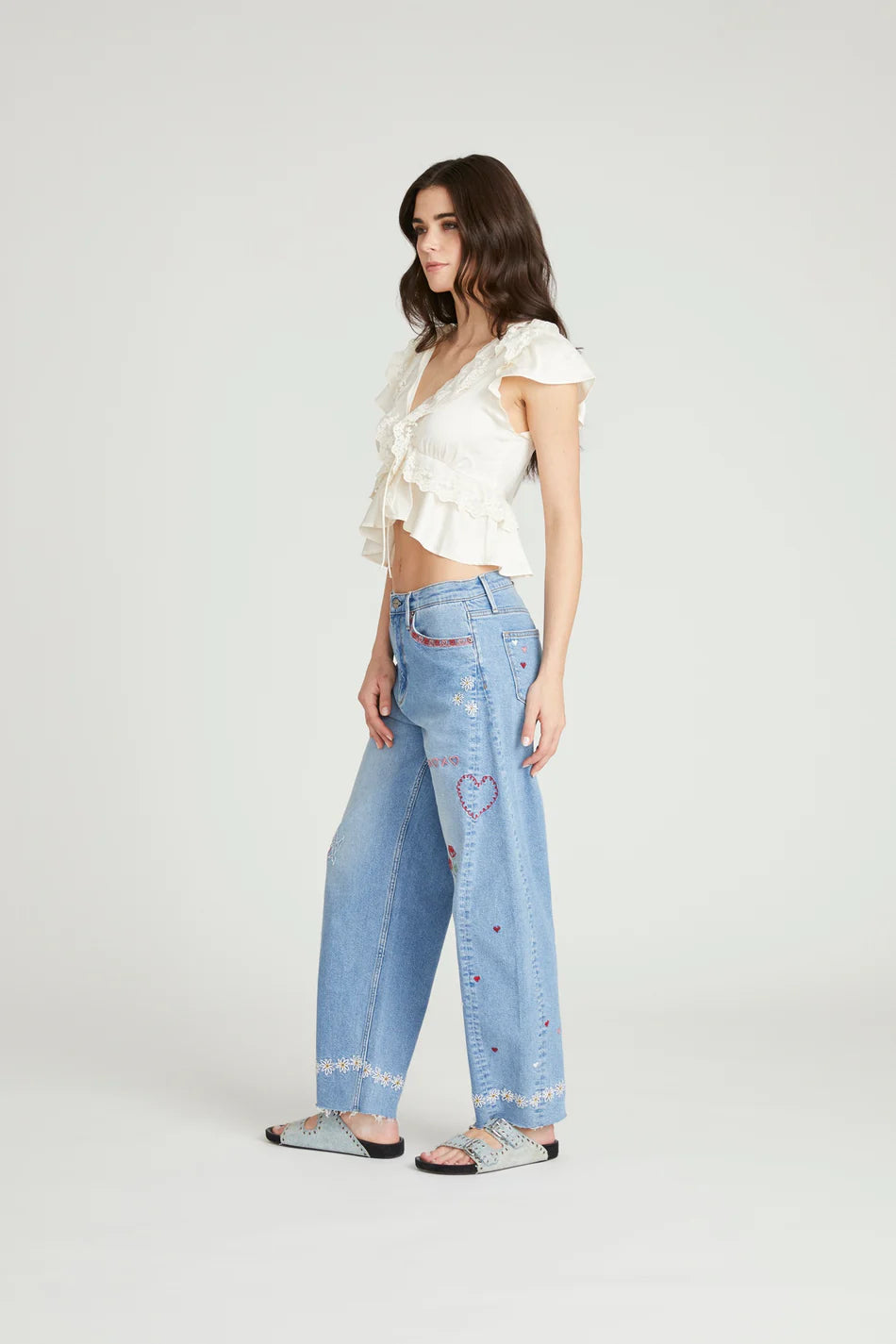 The Parker Wide Leg Barrel in Love Letters brings playful charm to a modern, statement silhouette. Designed in a light wash, this high-rise barrel jean features whimsical embroidery throughout, including hearts, florals, and handwritten-inspired details for an expressive, romantic finish. The structured wide leg with a subtle barrel shape creates an easy, fashion-forward fit that feels both relaxed and intentional.