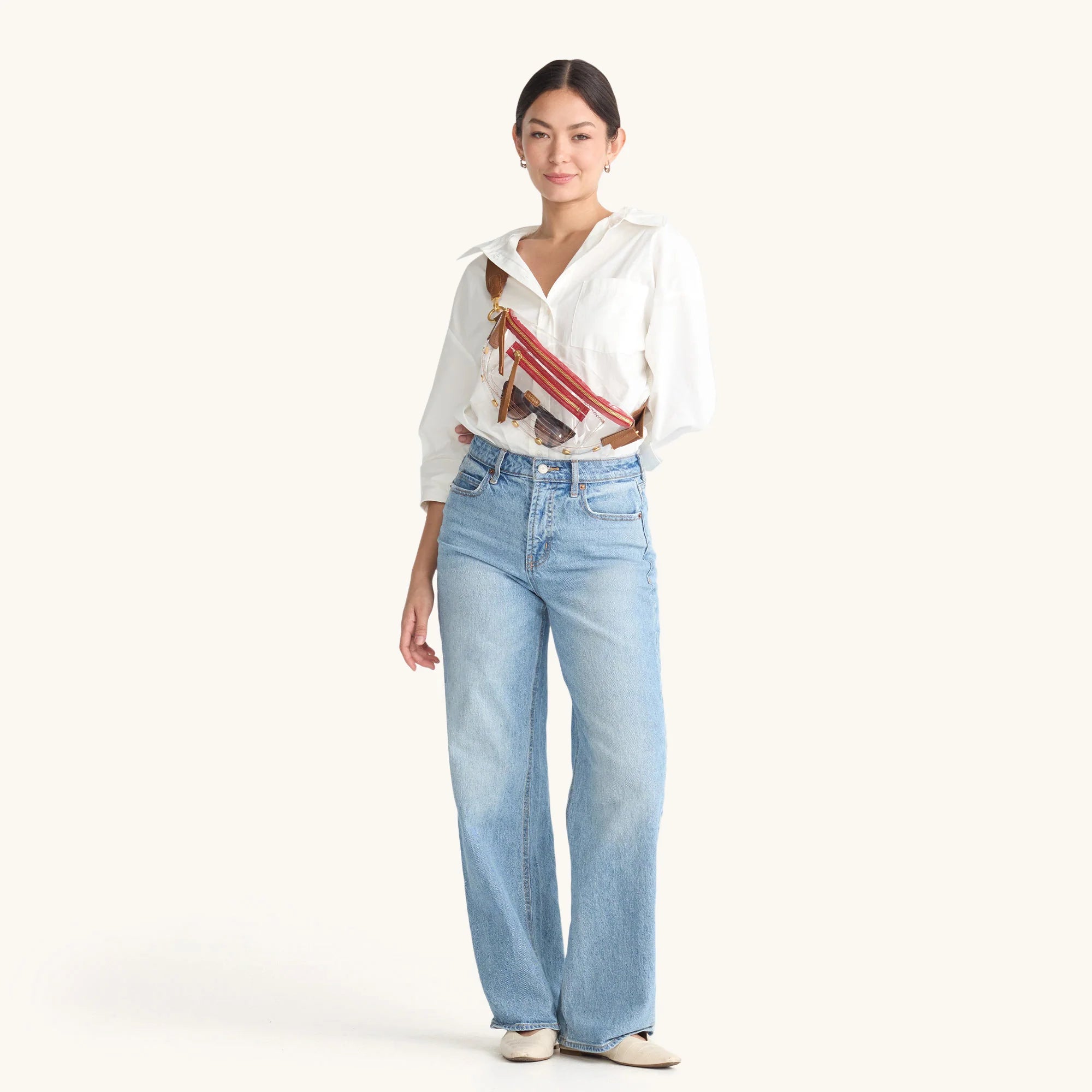 This updated take on our internet famous belt bag embraces the crossbody styling our fans have come to love, with size inclusivity in mind and a clear, stadium-approved twist. Plus, its long strap allows you to truly wear this style as a low slung crossbody, in addition to over your chest. Adorned with a hint of our signature soft pebbled leather with a hint of shine featuring a warm medium brown hue, brushed gold hardware and red zipper combo, this pairing will have you celebrating in the end zone.