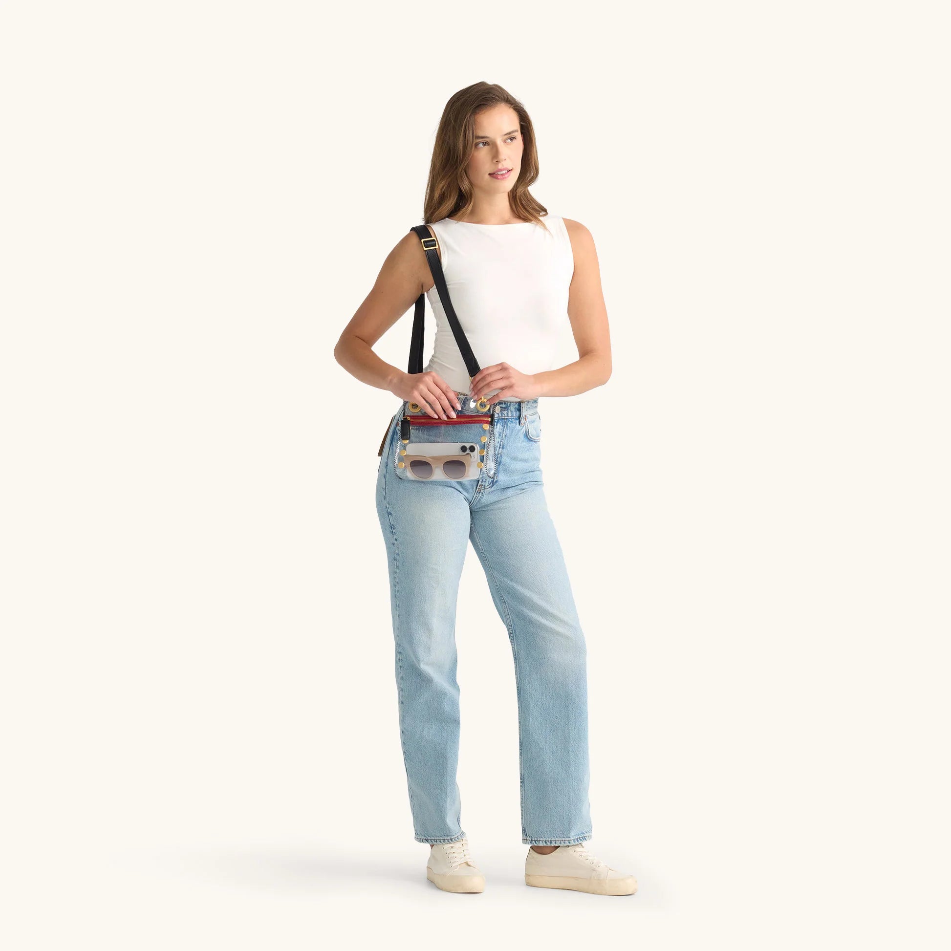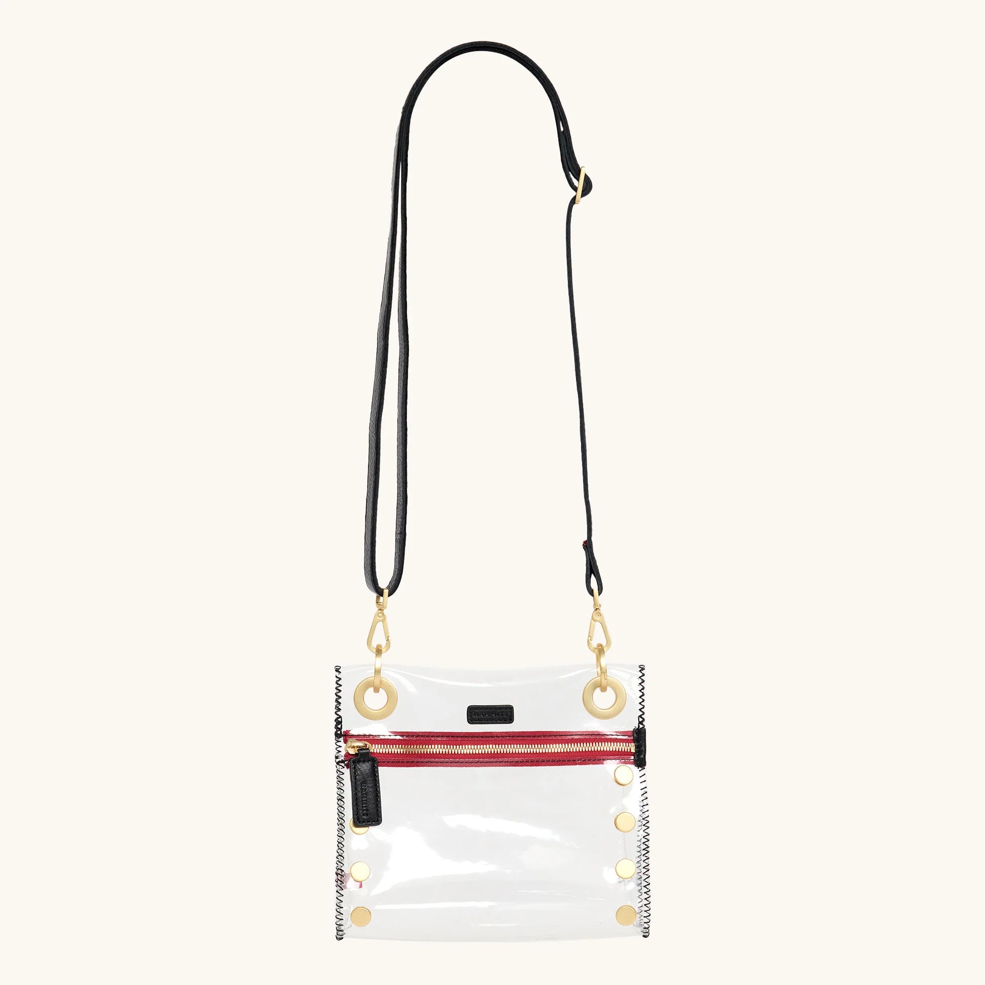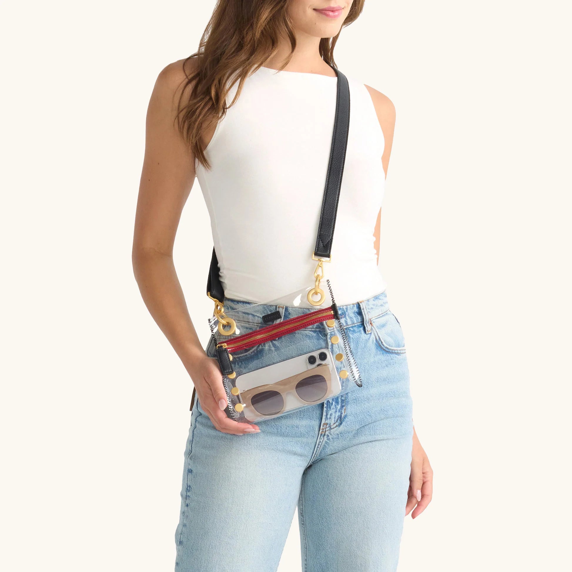 Our classic crossbody, complete with a clear, stadium-approved twist. Breeze through security in style thanks to the internet's best stadium-approved clear bag. Crafted with flexible TPU and leather trim, this guideline-ready size was designed to take on sporting arenas, concerts, festivals, airports and beyond. Plus, find your perfect fit with an adjustable crossbody strap. Adorned with a hint of our signature black leather, brushed gold hardware and an iconic red zipper, this new arrival is sure to have you celebrating in the end zone.