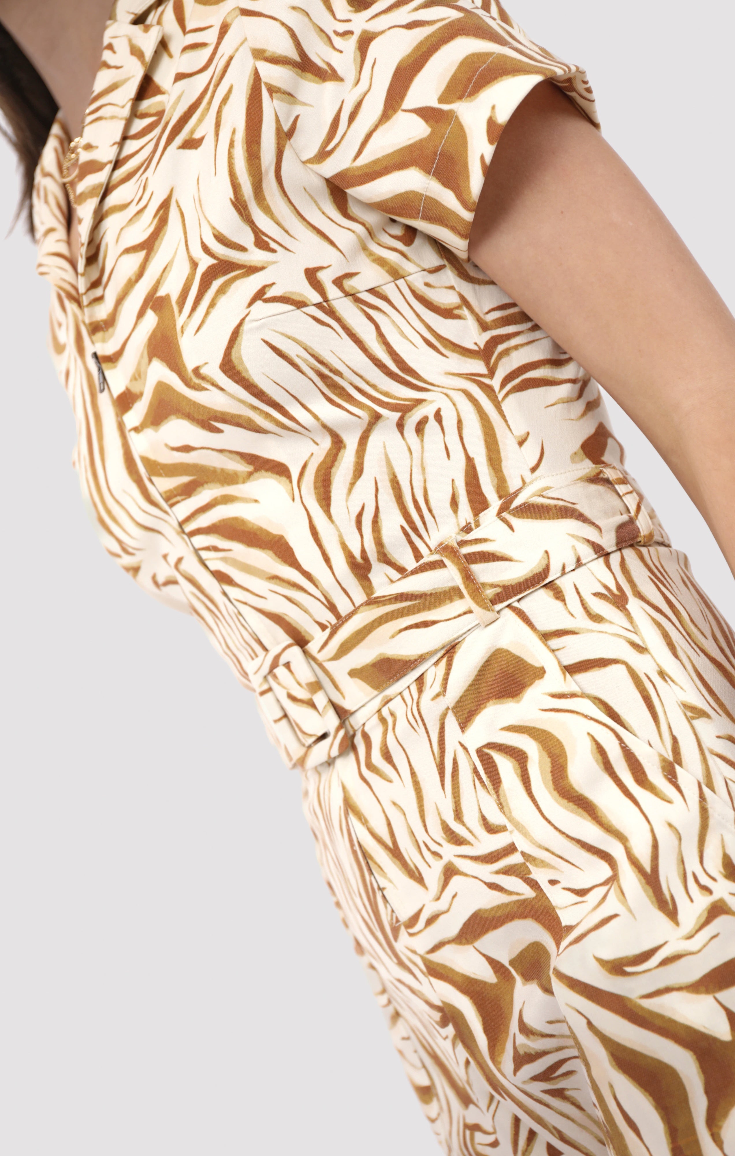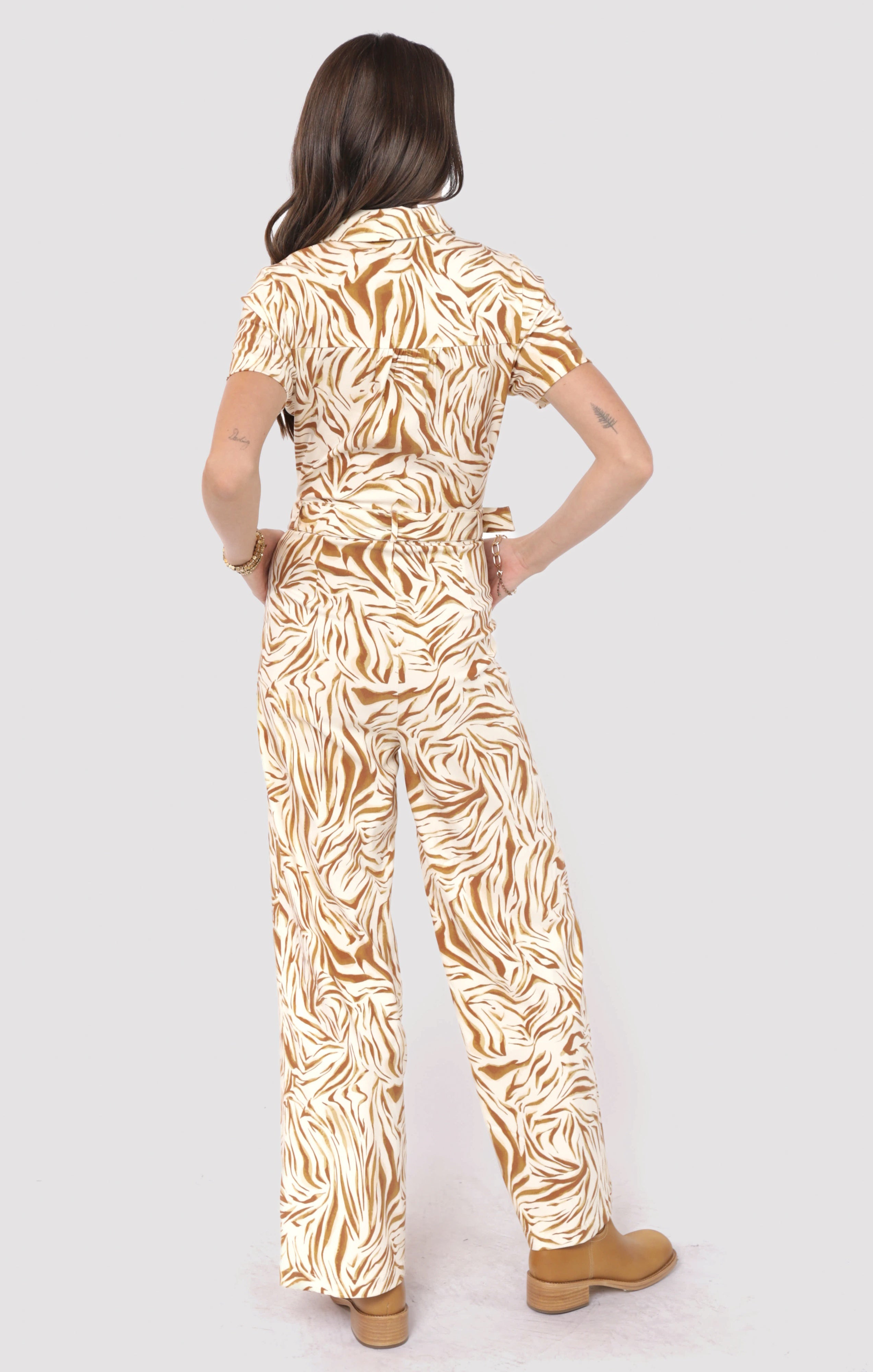 Chic, effortless, and made to stand out — the City Boheme Jumpsuit is a one-and-done statement piece. Designed in a bold camel-and-white zebra print, it’s cut with a collared neckline, short sleeves, and a button-down front that blends polish with ease. A self-tie belt cinches the waist for a flattering fit, while the wide-leg silhouette elongates the frame and moves beautifully with every step. Crafted in a soft stretch fabric, this jumpsuit delivers all-day comfort without compromising style. Perfect for brunch, travel, or a night out — just add heels or sneakers to make it your own.