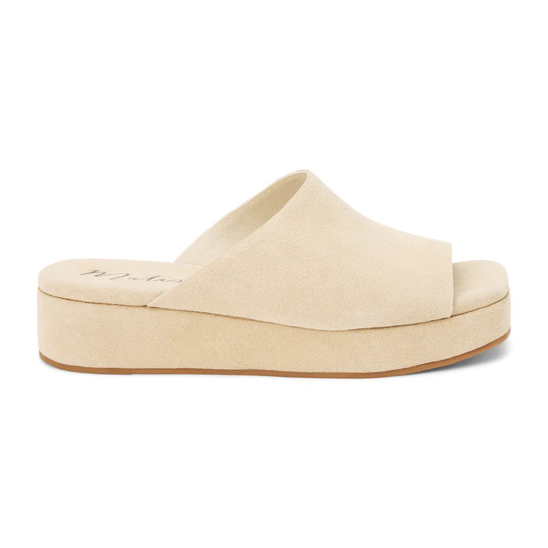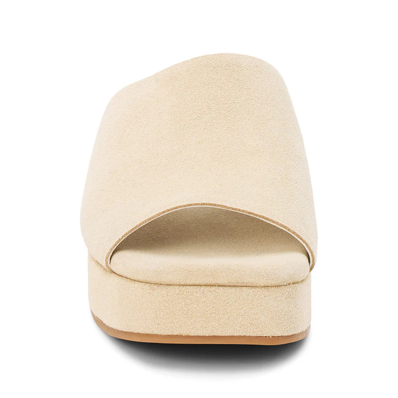 Lido slide sandal by Matisse showcases a soft sand suede upper with a cushioned platform sole for an elevated yet effortless slide style.