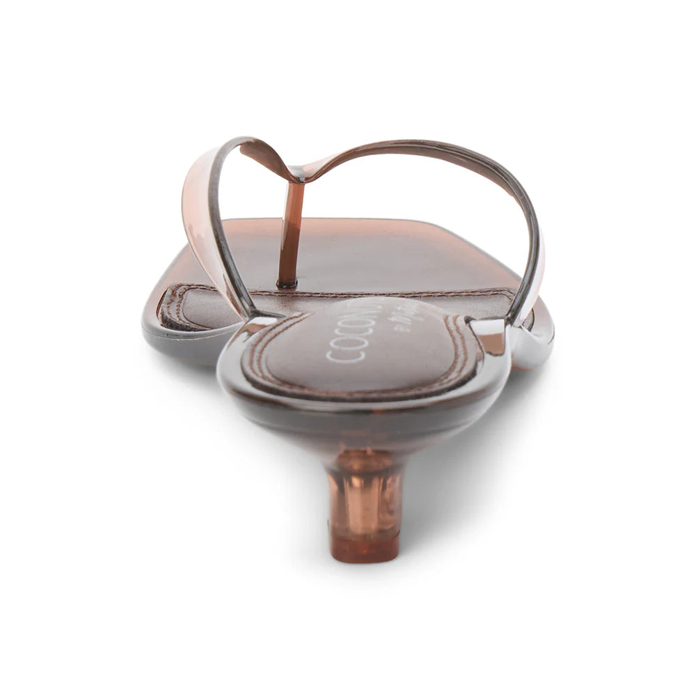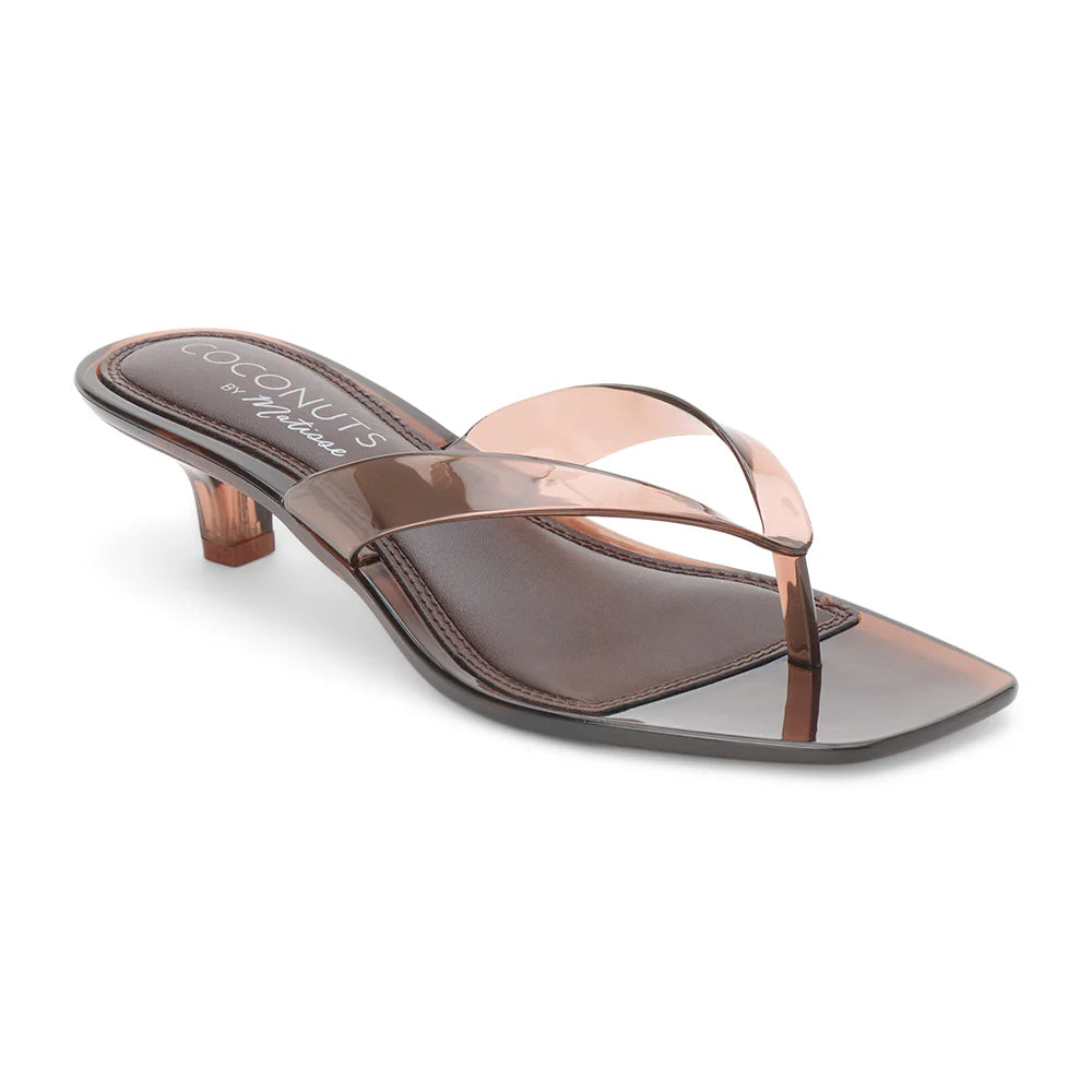 The Margo vegan heeled sandal by Coconuts by Matisse features a translucent brown jelly upper with sleek straps and a low kitten heel for modern, minimalist appeal.