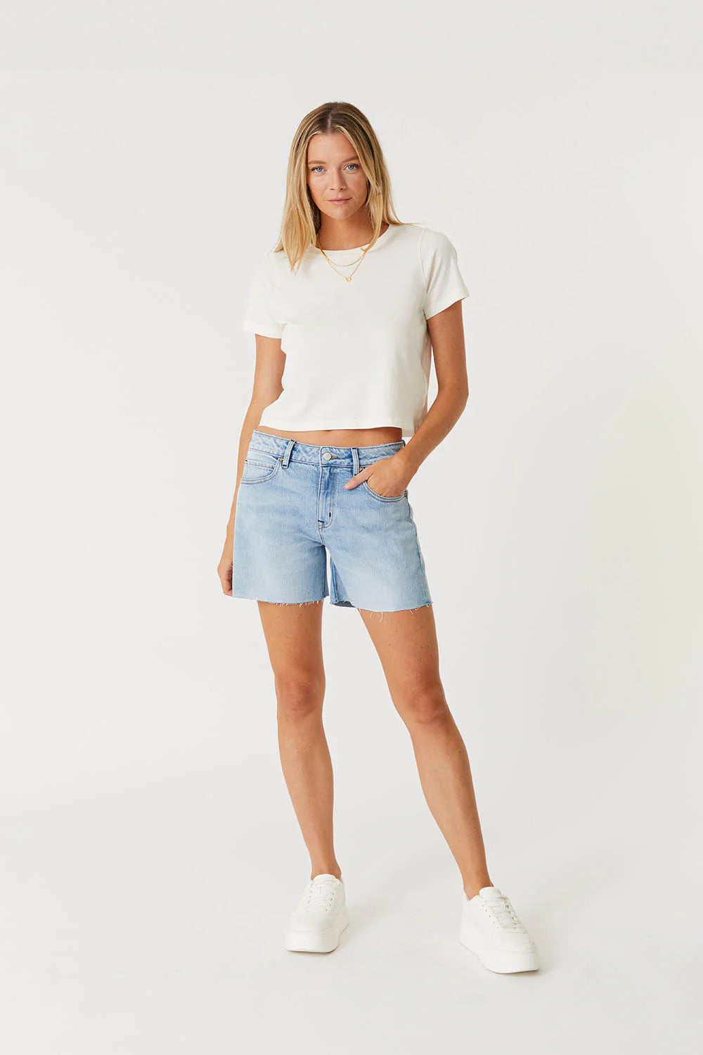 Maja cool vintage cut off short has a flattering mid-rise, classic 5pkt styling and raw hem. They are cut from soft, mid-weight denim with a hint of stretch for all day comfort. A classic fit, thigh grazing shorts that skim your curves just right.