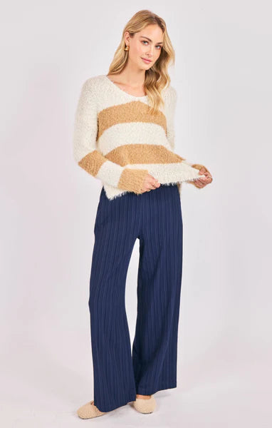 Wrap yourself in cozy comfort with this delightfully fuzzy striped v-neck sweater. The playful stripe pattern adds visual interest while the soft blend of polyester and nylon creates a luxuriously touchable texture that feels amazing against your skin. Perfect for layering or wearing solo, this sweater brings effortless style and warmth to your everyday wardrobe.