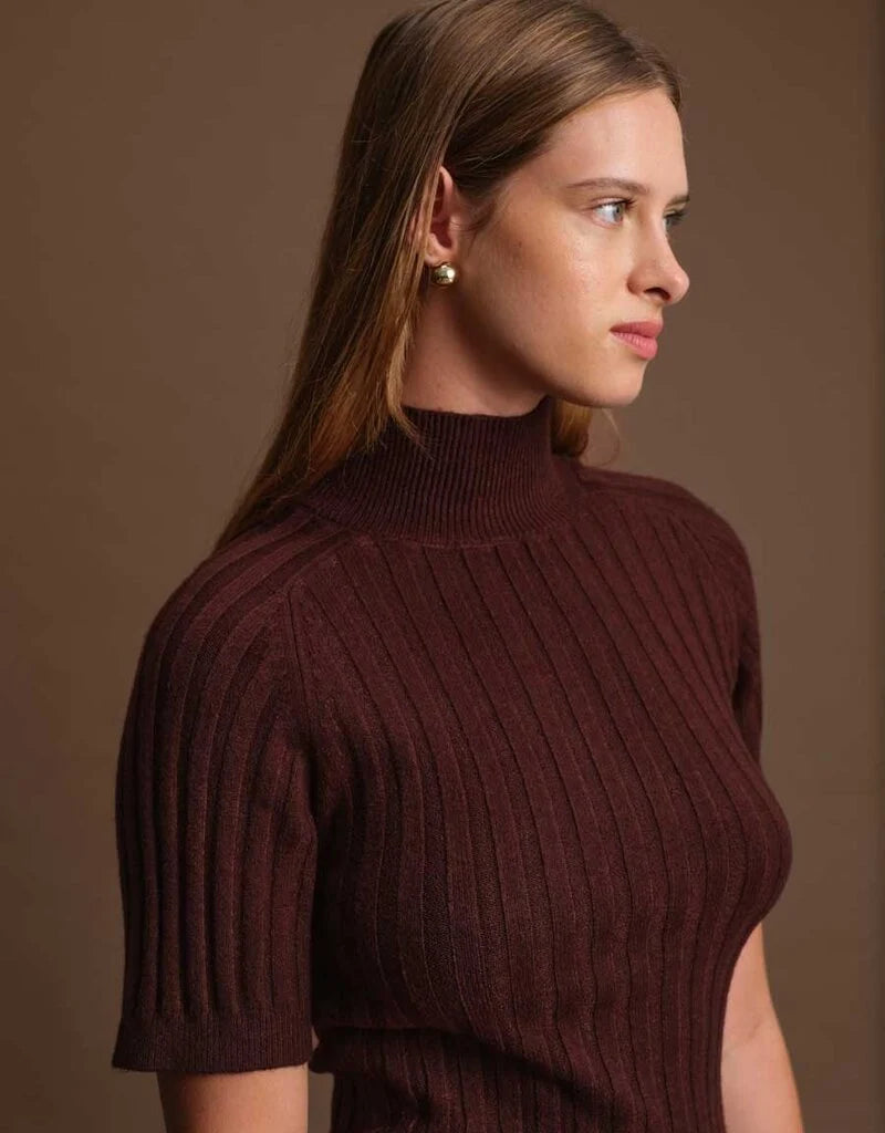 The Oliver Turtleneck Knit Top is a super classic, ribbed top. We love this stunning cacao colour for mixing with other solids or patterns!