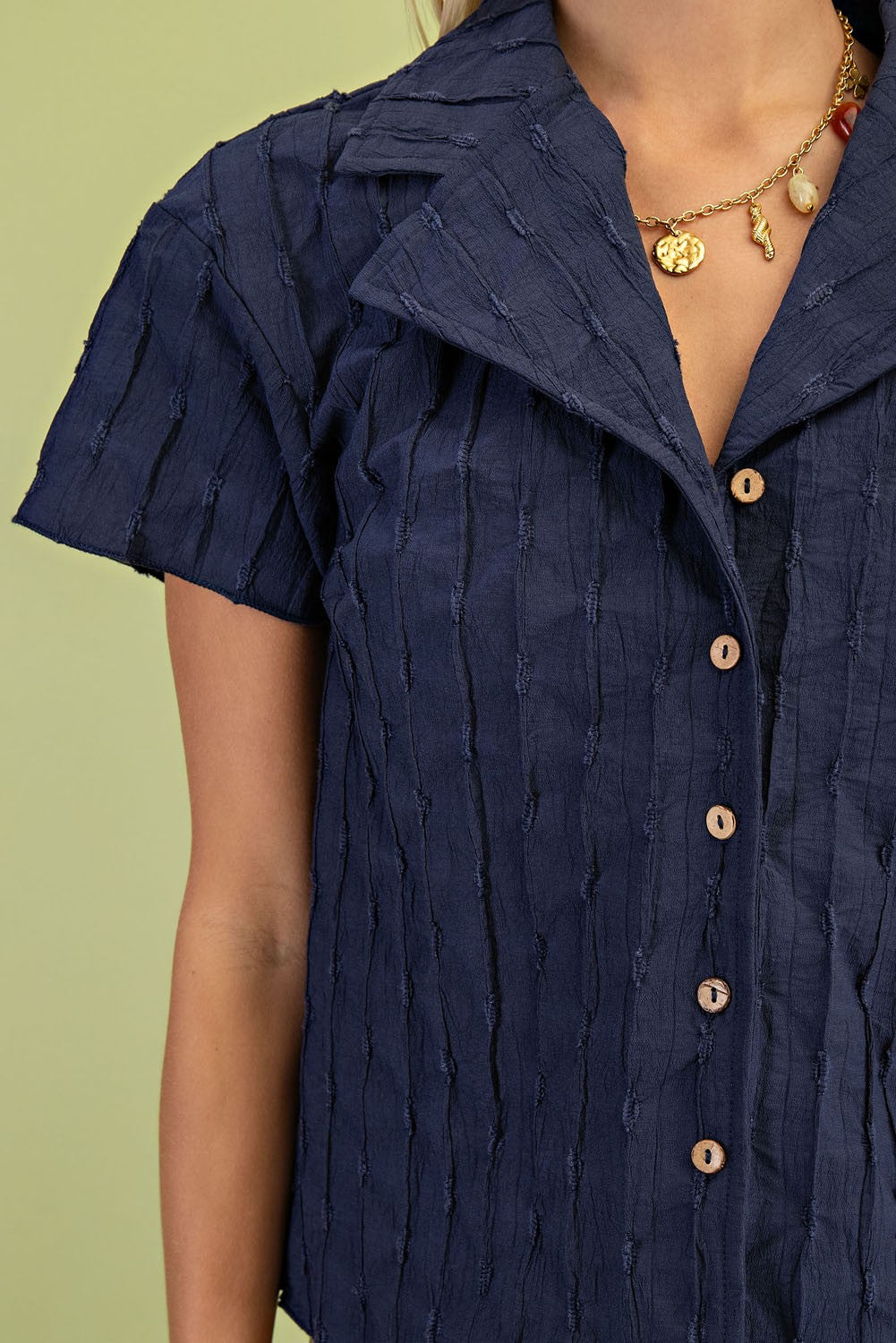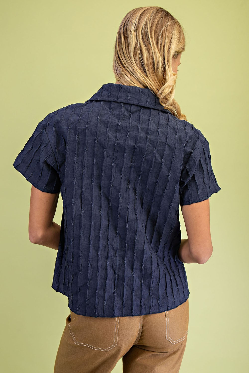 Textured Button Down Shirt with a Collar Models are 5'7" and 5'9" both wearing a small.