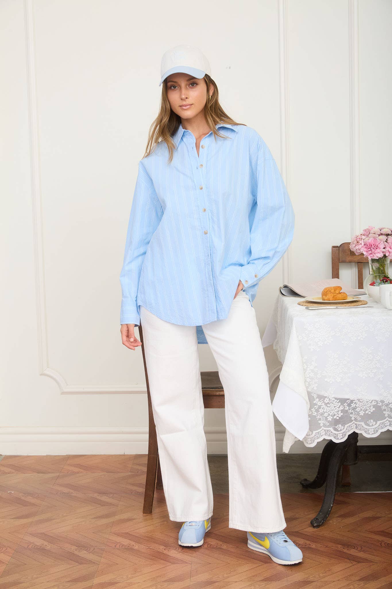 A refined woven cotton shirt featuring a classic collar and button-front closure. The relaxed silhouette offers comfortable everyday wear, while the unlined construction provides breathability. Finished with a distinctive stripe pattern and understated hem detail, this versatile piece transitions seamlessly from casual to smart-casual settings. Pure cotton construction ensures durability and natural comfort.