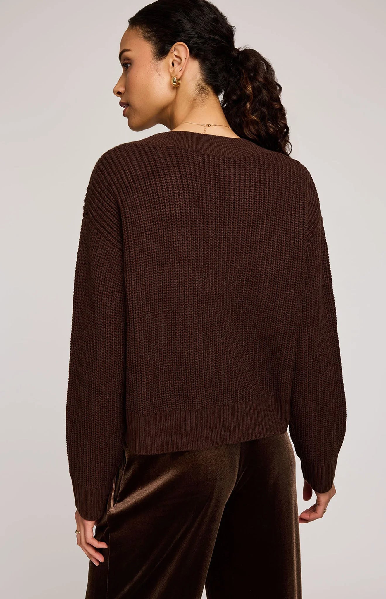 The Marcie sweater is made of a soft yarn. Features include a v-neckline and cable knit details throughout