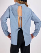 Throw on this oversized button-down and let the playful microstripes do the talking. The back tie detail adds a cheeky twist that transforms a classic piece into something with serious personality. Perfect for those days when you want to look effortlessly put-together while keeping things fun and flirty.