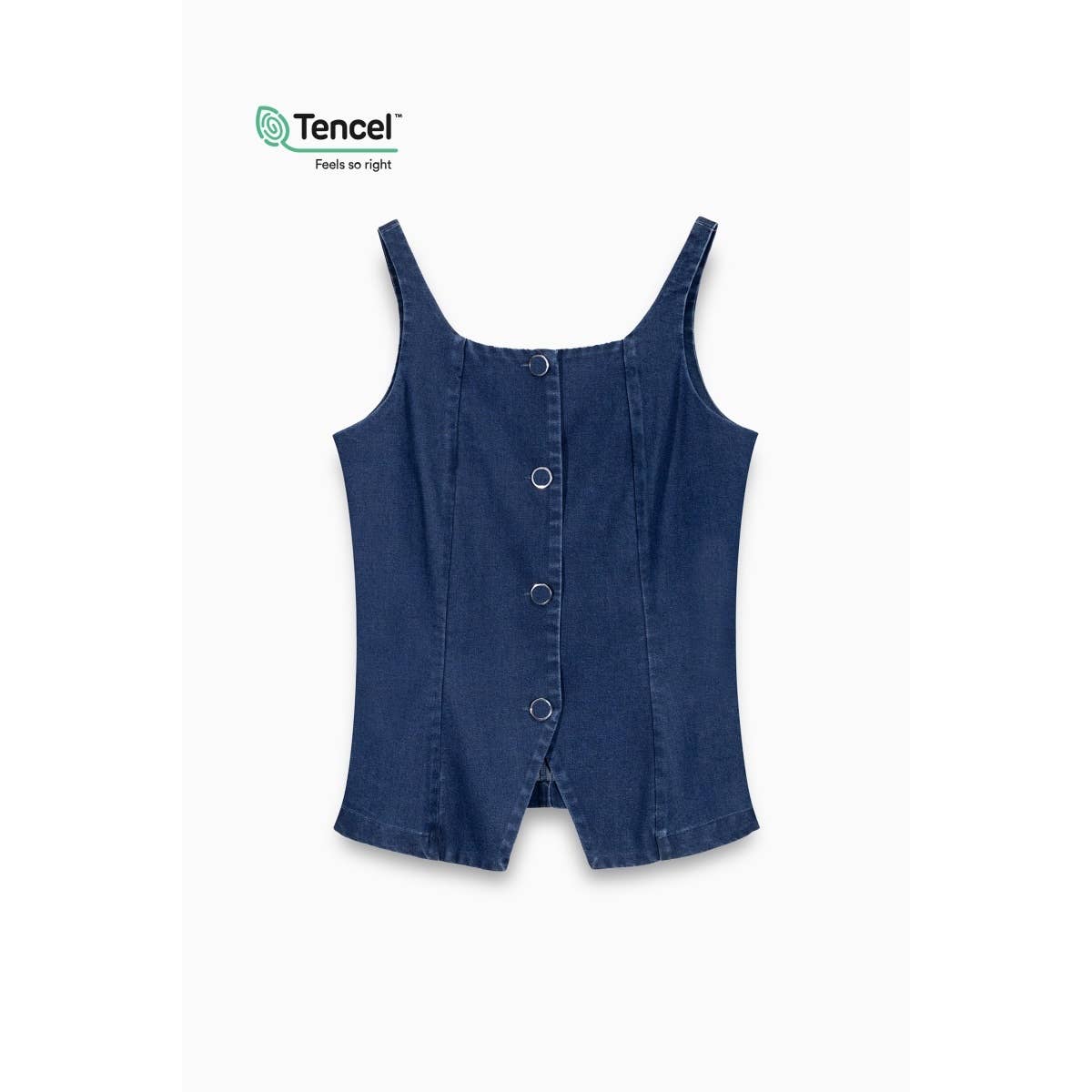 This women's denim vest top features a trendy square neckline that adds a fun, flattering touch. Made from ultra-soft, breathable Tencel™ fabric, it feels smooth and comfy all day long. Perfect for layering or rocking on its own, it brings easy, stylish vibes to any outfit. Crafted from a woven blend of 65% Tencel, 34% polyester, and 1% spandex. Care tip: hand wash cold to keep it looking fresh!